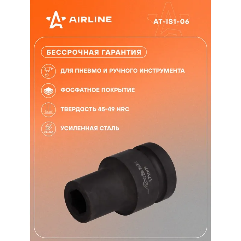 Головка ударная торцевая 1"DR шестигранная 17мм L=78 мм Описание: Головка ударная торцевая 1" DR шестигранная AT-IS1-06 бренда AIRLINE Головка рассчитана на использование совместно с пневматическим гайковёртом и усилителем крутящего момента. - Материал - сталь 42CrMo; - Твердость - 45-49 HRC; - Покрытие - фосфатирование; - Материал обеспечивает стойкость к высоким нагрузкам. - Ударные головки для гайковерта, электроинструмента, пневмогайковерта, ручного инструмента и шуруповерта облегчат выполняемые задач. - В корпусе есть сквозное отверстие под штифт. Применение головки: при сборке и разборке узлов автомобиля, для монтажа и демонтажа колес легковых и грузовых автомобилей, в шиномонтажах, автосервисе, СТО. Рекомендуется для профессионального использования. Ударная торцевая головка дополнит набор инструментов для автомобиля который удобно хранить в багажнике машины, гараже, дома, а также легко транспортировать. Ударные головки значительно облегчают ремонт автомобиля и сокращают затраченное время на работу. Профессиональный набор инструментов для автомобиля, дома это отличный вариант для подарка мужчине, мужу, дедушке, автомобилисту, на день рождения, новый год, 23 февраля и без повода. Характеристики: Артикул: AT-IS1-06 Комплектация: Головка торцевая - 1 шт Гарантия: от 1 года.