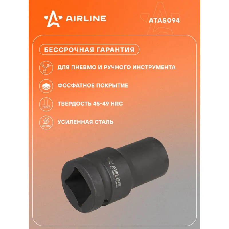 Головка ударная торцевая 1"DR шестигранная 21 мм L=90 мм Описание: Головка ударная торцевая 1" DR шестигранная 90 мм ATAS094 бренда AIRLINE Головка рассчитана на использование совместно с пневматическим гайковёртом и усилителем крутящего момента. - Материал - сталь 42CrMo; - Твердость - 45-49 HRC; - Покрытие - фосфатирование; - Материал обеспечивает стойкость к высоким нагрузкам. - Ударные головки для гайковерта, электроинструмента, пневмогайковерта, ручного инструмента и шуруповерта облегчат выполняемые задач. - В корпусе есть сквозное отверстие под штифт. Применение головки: при сборке и разборке узлов автомобиля, для монтажа и демонтажа колес легковых и грузовых автомобилей, в шиномонтажах, автосервисе, СТО. Рекомендуется для профессионального использования. Ударная торцевая головка дополнит набор инструментов для автомобиля который удобно хранить в багажнике машины, гараже, дома, а также легко транспортировать. Ударные головки значительно облегчают ремонт автомобиля и сокращают затраченное время на работу. Профессиональный набор инструментов для автомобиля, дома это отличный вариант для подарка мужчине, мужу, дедушке, автомобилисту, на день рождения, новый год, 23 февраля и без повода. Характеристики: Артикул: ATAS094 Длина, мм: 90 Размер, мм: 21 Присоединительный квадрат: 1"DR Комплектация: Головка торцевая - 1 шт Гарантия: от 1 года.