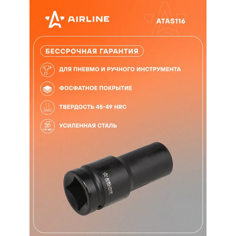 Головка ударная торцевая 1"DR шестигранная 22 мм L=110 мм Описание: Головка ударная торцевая 1" DR шестигранная ATAS116 бренда AIRLINE Головка рассчитана на использование совместно с пневматическим гайковёртом и усилителем крутящего момента. - Материал - сталь 42CrMo; - Твердость - 45-49 HRC; - Покрытие - фосфатирование; - Материал обеспечивает стойкость к высоким нагрузкам. - Ударные головки для гайковерта, электроинструмента, пневмогайковерта, ручного инструмента и шуруповерта облегчат выполняемые задач. - В корпусе есть сквозное отверстие под штифт. Применение головки: при сборке и разборке узлов автомобиля, для монтажа и демонтажа колес легковых и грузовых автомобилей, в шиномонтажах, автосервисе, СТО. Рекомендуется для профессионального использования. Ударная торцевая головка дополнит набор инструментов для автомобиля который удобно хранить в багажнике машины, гараже, дома, а также легко транспортировать. Ударные головки значительно облегчают ремонт автомобиля и сокращают затраченное время на работу. Профессиональный набор инструментов для автомобиля, дома это отличный вариант для подарка мужчине, мужу, дедушке, автомобилисту, на день рождения, новый год, 23 февраля и без повода. Характеристики: Артикул: ATAS116 Присоединительный квадрат: 1"DR Комплектация: Головка торцевая - 1 шт Гарантия: от 1 года.
