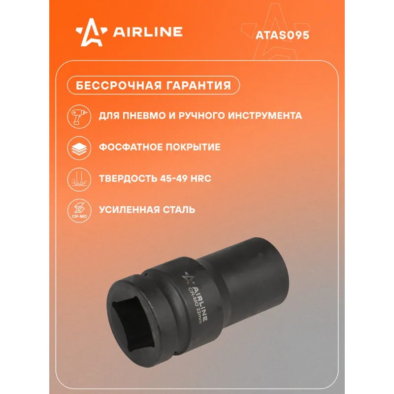 Головка ударная торцевая 1"DR шестигранная 22 мм L=90 мм Описание: Головка ударная торцевая 1" DR шестигранная 90 мм ATAS095 бренда AIRLINE Головка рассчитана на использование совместно с пневматическим гайковёртом и усилителем крутящего момента. - Материал - сталь 42CrMo; - Твердость - 45-49 HRC; - Покрытие - фосфатирование; - Материал обеспечивает стойкость к высоким нагрузкам. - Ударные головки для гайковерта, электроинструмента, пневмогайковерта, ручного инструмента и шуруповерта облегчат выполняемые задач. - В корпусе есть сквозное отверстие под штифт. Применение головки: при сборке и разборке узлов автомобиля, для монтажа и демонтажа колес легковых и грузовых автомобилей, в шиномонтажах, автосервисе, СТО. Рекомендуется для профессионального использования. Ударная торцевая головка дополнит набор инструментов для автомобиля который удобно хранить в багажнике машины, гараже, дома, а также легко транспортировать. Ударные головки значительно облегчают ремонт автомобиля и сокращают затраченное время на работу. Профессиональный набор инструментов для автомобиля, дома это отличный вариант для подарка мужчине, мужу, дедушке, автомобилисту, на день рождения, новый год, 23 февраля и без повода. Характеристики: Артикул: ATAS095 Длина, мм: 90 Размер, мм: 22 Присоединительный квадрат: 1"DR Комплектация: Головка торцевая - 1 шт Гарантия: от 1 года.