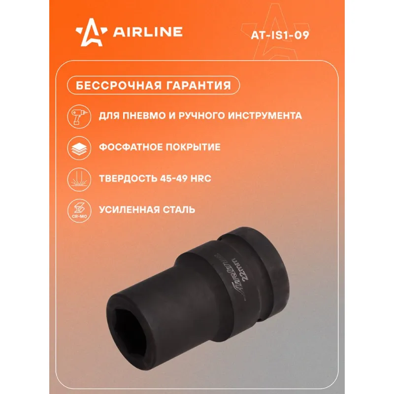 Головка ударная торцевая 1"DR шестигранная 22мм L=78 мм Описание: Головка ударная торцевая 1" DR шестигранная 78 мм AT-IS1-09 бренда AIRLINE Головка рассчитана на использование совместно с пневматическим гайковёртом и усилителем крутящего момента. - Материал - сталь 42CrMo; - Твердость - 45-49 HRC; - Покрытие - фосфатирование; - Материал обеспечивает стойкость к высоким нагрузкам. - Ударные головки для гайковерта, электроинструмента, пневмогайковерта, ручного инструмента и шуруповерта облегчат выполняемые задач. - В корпусе есть сквозное отверстие под штифт. Применение головки: при сборке и разборке узлов автомобиля, для монтажа и демонтажа колес легковых и грузовых автомобилей, в шиномонтажах, автосервисе, СТО. Рекомендуется для профессионального использования. Ударная торцевая головка дополнит набор инструментов для автомобиля который удобно хранить в багажнике машины, гараже, дома, а также легко транспортировать. Ударные головки значительно облегчают ремонт автомобиля и сокращают затраченное время на работу. Профессиональный набор инструментов для автомобиля, дома это отличный вариант для подарка мужчине, мужу, дедушке, автомобилисту, на день рождения, новый год, 23 февраля и без повода. Характеристики: Артикул: AT-IS1-09 OEM номера: 40122 Длина, мм: 78 Размер, мм: 22 Присоединительный квадрат: 1"DR Комплектация: Головка торцевая - 1 шт Гарантия: от 1 года.