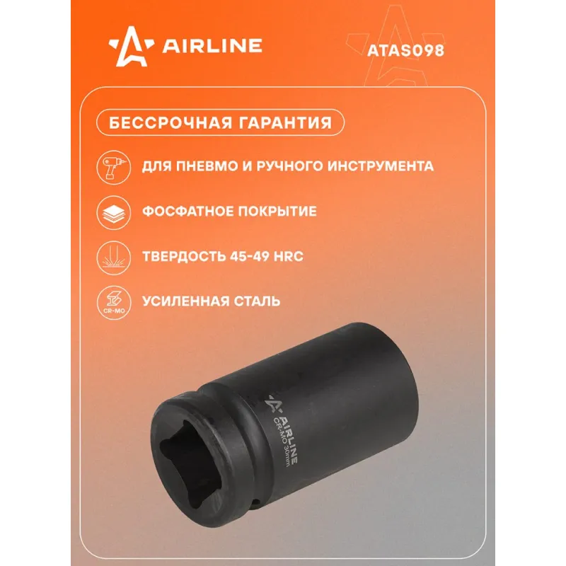 Головка ударная торцевая 1"DR шестигранная 30 мм L=90 мм Описание: Головка ударная торцевая 1" DR шестигранная 90 мм ATAS098 бренда AIRLINE Головка рассчитана на использование совместно с пневматическим гайковёртом и усилителем крутящего момента. - Материал - сталь 42CrMo; - Твердость - 45-49 HRC; - Покрытие - фосфатирование; - Материал обеспечивает стойкость к высоким нагрузкам. - Ударные головки для гайковерта, электроинструмента, пневмогайковерта, ручного инструмента и шуруповерта облегчат выполняемые задач. - В корпусе есть сквозное отверстие под штифт. Применение головки: при сборке и разборке узлов автомобиля, для монтажа и демонтажа колес легковых и грузовых автомобилей, в шиномонтажах, автосервисе, СТО. Рекомендуется для профессионального использования. Ударная торцевая головка дополнит набор инструментов для автомобиля который удобно хранить в багажнике машины, гараже, дома, а также легко транспортировать. Ударные головки значительно облегчают ремонт автомобиля и сокращают затраченное время на работу. Профессиональный набор инструментов для автомобиля, дома это отличный вариант для подарка мужчине, мужу, дедушке, автомобилисту, на день рождения, новый год, 23 февраля и без повода. Характеристики: Артикул: ATAS098 Длина, мм: 90 Размер, мм: 30 Присоединительный квадрат: 1"DR Комплектация: Головка торцевая - 1 шт Гарантия: от 1 года.