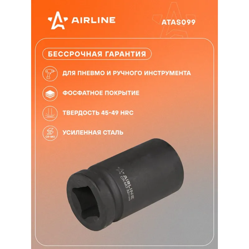 Головка ударная торцевая 1"DR шестигранная 32 мм L=90 мм Описание: Головка ударная торцевая 1" DR шестигранная 90 мм ATAS099 бренда AIRLINE Головка рассчитана на использование совместно с пневматическим гайковёртом и усилителем крутящего момента. - Материал - сталь 42CrMo; - Твердость - 45-49 HRC; - Покрытие - фосфатирование; - Материал обеспечивает стойкость к высоким нагрузкам. - Ударные головки для гайковерта, электроинструмента, пневмогайковерта, ручного инструмента и шуруповерта облегчат выполняемые задач. - В корпусе есть сквозное отверстие под штифт. Применение головки: при сборке и разборке узлов автомобиля, для монтажа и демонтажа колес легковых и грузовых автомобилей, в шиномонтажах, автосервисе, СТО. Рекомендуется для профессионального использования. Ударная торцевая головка дополнит набор инструментов для автомобиля который удобно хранить в багажнике машины, гараже, дома, а также легко транспортировать. Ударные головки значительно облегчают ремонт автомобиля и сокращают затраченное время на работу. Профессиональный набор инструментов для автомобиля, дома это отличный вариант для подарка мужчине, мужу, дедушке, автомобилисту, на день рождения, новый год, 23 февраля и без повода. Характеристики: Артикул: ATAS099 Длина, мм: 90 Размер, мм: 32 Присоединительный квадрат: 1"DR Комплектация: Головка торцевая - 1 шт Гарантия: от 1 года.
