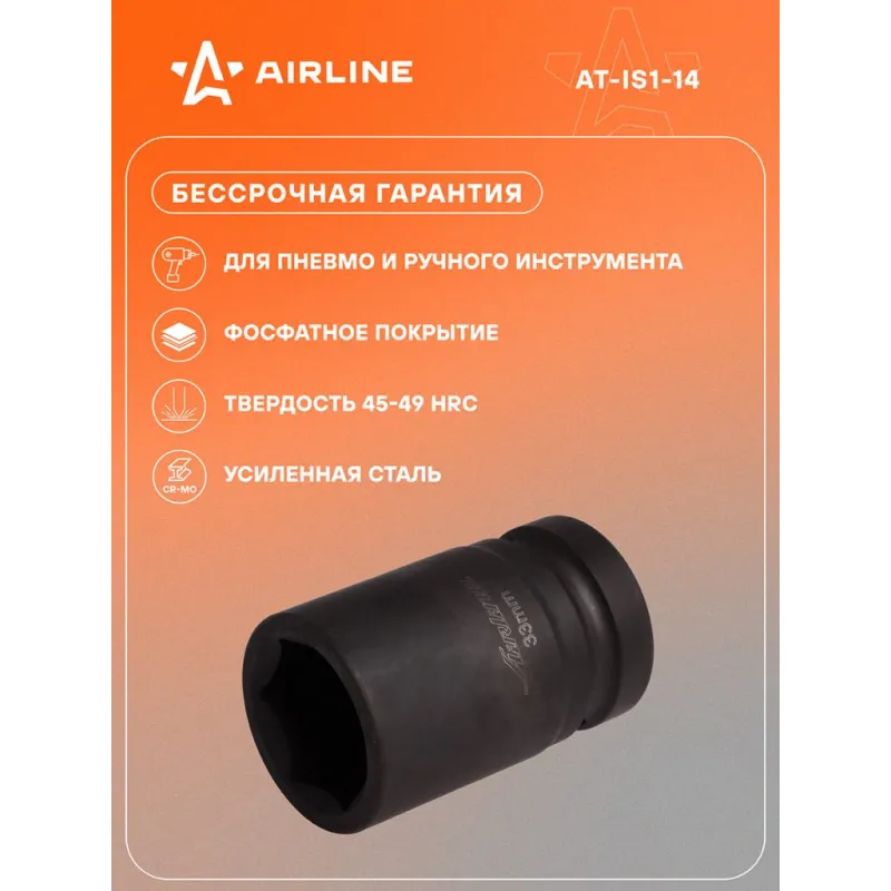 Головка ударная торцевая 1"DR шестигранная 33мм L=78 мм Описание: Головка ударная торцевая 1" DR шестигранная 78 мм AT-IS1-14 бренда AIRLINE Головка рассчитана на использование совместно с пневматическим гайковёртом и усилителем крутящего момента. - Материал - сталь 42CrMo; - Твердость - 45-49 HRC; - Покрытие - фосфатирование; - Материал обеспечивает стойкость к высоким нагрузкам. - Ударные головки для гайковерта, электроинструмента, пневмогайковерта, ручного инструмента и шуруповерта облегчат выполняемые задач. - В корпусе есть сквозное отверстие под штифт. Применение головки: при сборке и разборке узлов автомобиля, для монтажа и демонтажа колес легковых и грузовых автомобилей, в шиномонтажах, автосервисе, СТО. Рекомендуется для профессионального использования. Ударная торцевая головка дополнит набор инструментов для автомобиля который удобно хранить в багажнике машины, гараже, дома, а также легко транспортировать. Ударные головки значительно облегчают ремонт автомобиля и сокращают затраченное время на работу. Профессиональный набор инструментов для автомобиля, дома это отличный вариант для подарка мужчине, мужу, дедушке, автомобилисту, на день рождения, новый год, 23 февраля и без повода. Характеристики: Артикул: AT-IS1-14 OEM номера: 40333, 640033, LSWS00133, S03A8133 Длина, мм: 78 Размер, мм: 33 Присоединительный квадрат: 1"DR Комплектация: Головка торцевая - 1 шт Гарантия: от 1 года.