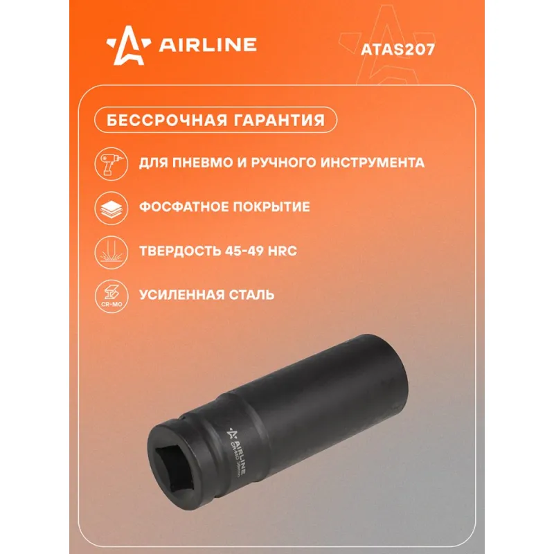 Головка ударная торцевая 1"DR шестигранная 36 мм L=160 мм Описание: Головка ударная торцевая 1" DR шестигранная ATAS207 бренда AIRLINE Головка рассчитана на использование совместно с пневматическим гайковёртом и усилителем крутящего момента. - Материал - сталь 42CrMo; - Твердость - 45-49 HRC; - Покрытие - фосфатирование; - Материал обеспечивает стойкость к высоким нагрузкам. - Ударные головки для гайковерта, электроинструмента, пневмогайковерта, ручного инструмента и шуруповерта облегчат выполняемые задач. - В корпусе есть сквозное отверстие под штифт. Применение головки: при сборке и разборке узлов автомобиля, для монтажа и демонтажа колес легковых и грузовых автомобилей, в шиномонтажах, автосервисе, СТО. Рекомендуется для профессионального использования. Ударная торцевая головка дополнит набор инструментов для автомобиля который удобно хранить в багажнике машины, гараже, дома, а также легко транспортировать. Ударные головки значительно облегчают ремонт автомобиля и сокращают затраченное время на работу. Профессиональный набор инструментов для автомобиля, дома это отличный вариант для подарка мужчине, мужу, дедушке, автомобилисту, на день рождения, новый год, 23 февраля и без повода. Характеристики: Артикул: ATAS207 Комплектация: Головка торцевая - 1 шт Гарантия: от 1 года.