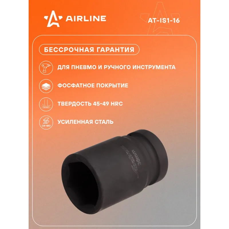 Головка ударная торцевая 1"DR шестигранная 36мм L=78 мм Описание: Головка ударная торцевая 1" DR шестигранная 78 мм AT-IS1-16 бренда AIRLINE Головка рассчитана на использование совместно с пневматическим гайковёртом и усилителем крутящего момента. - Материал - сталь 42CrMo; - Твердость - 45-49 HRC; - Покрытие - фосфатирование; - Материал обеспечивает стойкость к высоким нагрузкам. - Ударные головки для гайковерта, электроинструмента, пневмогайковерта, ручного инструмента и шуруповерта облегчат выполняемые задач. - В корпусе есть сквозное отверстие под штифт. Применение головки: при сборке и разборке узлов автомобиля, для монтажа и демонтажа колес легковых и грузовых автомобилей, в шиномонтажах, автосервисе, СТО. Рекомендуется для профессионального использования. Ударная торцевая головка дополнит набор инструментов для автомобиля который удобно хранить в багажнике машины, гараже, дома, а также легко транспортировать. Ударные головки значительно облегчают ремонт автомобиля и сокращают затраченное время на работу. Профессиональный набор инструментов для автомобиля, дома это отличный вариант для подарка мужчине, мужу, дедушке, автомобилисту, на день рождения, новый год, 23 февраля и без повода. Характеристики: Артикул: AT-IS1-16 OEM номера: 40336, 640036, LSWS00136, S03A8136 Длина, мм: 78 Размер, мм: 36 Присоединительный квадрат: 1"DR Комплектация: Головка торцевая - 1 шт Гарантия: от 1 года.