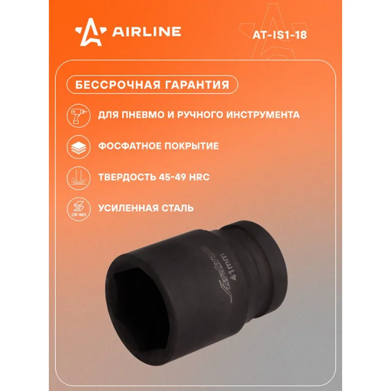 Головка ударная торцевая 1"DR шестигранная 41мм L=78 мм Описание: Головка ударная торцевая 1" DR шестигранная 78 мм AT-IS1-18 бренда AIRLINE Головка рассчитана на использование совместно с пневматическим гайковёртом и усилителем крутящего момента. - Материал - сталь 42CrMo; - Твердость - 45-49 HRC; - Покрытие - фосфатирование; - Материал обеспечивает стойкость к высоким нагрузкам. - Ударные головки для гайковерта, электроинструмента, пневмогайковерта, ручного инструмента и шуруповерта облегчат выполняемые задач. - В корпусе есть сквозное отверстие под штифт. Применение головки: при сборке и разборке узлов автомобиля, для монтажа и демонтажа колес легковых и грузовых автомобилей, в шиномонтажах, автосервисе, СТО. Рекомендуется для профессионального использования. Ударная торцевая головка дополнит набор инструментов для автомобиля который удобно хранить в багажнике машины, гараже, дома, а также легко транспортировать. Ударные головки значительно облегчают ремонт автомобиля и сокращают затраченное время на работу. Профессиональный набор инструментов для автомобиля, дома это отличный вариант для подарка мужчине, мужу, дедушке, автомобилисту, на день рождения, новый год, 23 февраля и без повода. Характеристики: Артикул: AT-IS1-18 OEM номера: 40341, 640041, LSWS00141, S03A8141 Длина, мм: 78 Размер, мм: 41 Присоединительный квадрат: 1"DR Комплектация: Головка торцевая - 1 шт Гарантия: от 1 года.
