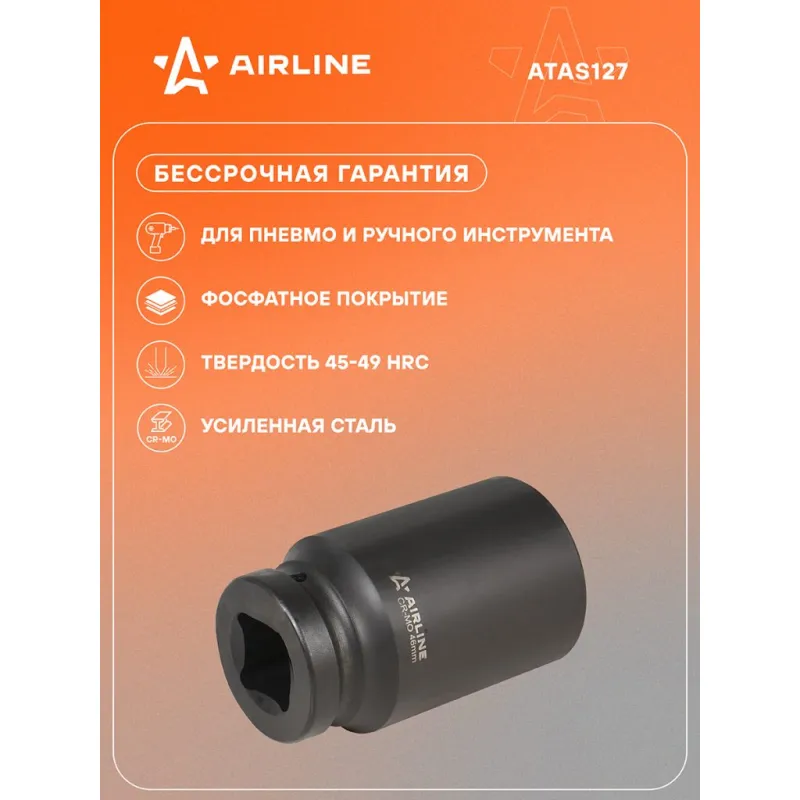Головка ударная торцевая 1"DR шестигранная 46 мм L=110 мм Описание: Головка ударная торцевая 1" DR шестигранная ATAS127 бренда AIRLINE Головка рассчитана на использование совместно с пневматическим гайковёртом и усилителем крутящего момента. - Материал - сталь 42CrMo; - Твердость - 45-49 HRC; - Покрытие - фосфатирование; - Материал обеспечивает стойкость к высоким нагрузкам. - Ударные головки для гайковерта, электроинструмента, пневмогайковерта, ручного инструмента и шуруповерта облегчат выполняемые задач. - В корпусе есть сквозное отверстие под штифт. Применение головки: при сборке и разборке узлов автомобиля, для монтажа и демонтажа колес легковых и грузовых автомобилей, в шиномонтажах, автосервисе, СТО. Рекомендуется для профессионального использования. Ударная торцевая головка дополнит набор инструментов для автомобиля который удобно хранить в багажнике машины, гараже, дома, а также легко транспортировать. Ударные головки значительно облегчают ремонт автомобиля и сокращают затраченное время на работу. Профессиональный набор инструментов для автомобиля, дома это отличный вариант для подарка мужчине, мужу, дедушке, автомобилисту, на день рождения, новый год, 23 февраля и без повода. Характеристики: Артикул: ATAS127 Присоединительный квадрат: 1"DR Комплектация: Головка торцевая - 1 шт Гарантия: от 1 года.
