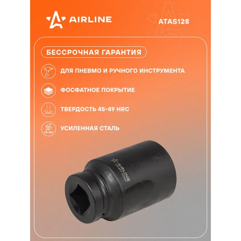 Головка ударная торцевая 1"DR шестигранная 50 мм L=110 мм Описание: Головка ударная торцевая 1" DR шестигранная ATAS128 бренда AIRLINE Головка рассчитана на использование совместно с пневматическим гайковёртом и усилителем крутящего момента. - Материал - сталь 42CrMo; - Твердость - 45-49 HRC; - Покрытие - фосфатирование; - Материал обеспечивает стойкость к высоким нагрузкам. - Ударные головки для гайковерта, электроинструмента, пневмогайковерта, ручного инструмента и шуруповерта облегчат выполняемые задач. - В корпусе есть сквозное отверстие под штифт. Применение головки: при сборке и разборке узлов автомобиля, для монтажа и демонтажа колес легковых и грузовых автомобилей, в шиномонтажах, автосервисе, СТО. Рекомендуется для профессионального использования. Ударная торцевая головка дополнит набор инструментов для автомобиля который удобно хранить в багажнике машины, гараже, дома, а также легко транспортировать. Ударные головки значительно облегчают ремонт автомобиля и сокращают затраченное время на работу. Профессиональный набор инструментов для автомобиля, дома это отличный вариант для подарка мужчине, мужу, дедушке, автомобилисту, на день рождения, новый год, 23 февраля и без повода. Характеристики: Артикул: ATAS128 Присоединительный квадрат: 1"DR Комплектация: Головка торцевая - 1 шт Гарантия: от 1 года.