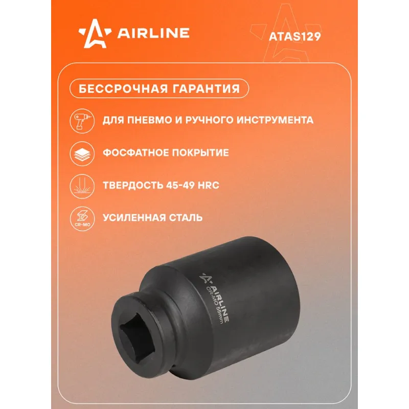 Головка ударная торцевая 1"DR шестигранная 55 мм L=110 мм Описание: Головка ударная торцевая 1" DR шестигранная ATAS129 бренда AIRLINE Головка рассчитана на использование совместно с пневматическим гайковёртом и усилителем крутящего момента. - Материал - сталь 42CrMo; - Твердость - 45-49 HRC; - Покрытие - фосфатирование; - Материал обеспечивает стойкость к высоким нагрузкам. - Ударные головки для гайковерта, электроинструмента, пневмогайковерта, ручного инструмента и шуруповерта облегчат выполняемые задач. - В корпусе есть сквозное отверстие под штифт. Применение головки: при сборке и разборке узлов автомобиля, для монтажа и демонтажа колес легковых и грузовых автомобилей, в шиномонтажах, автосервисе, СТО. Рекомендуется для профессионального использования. Ударная торцевая головка дополнит набор инструментов для автомобиля который удобно хранить в багажнике машины, гараже, дома, а также легко транспортировать. Ударные головки значительно облегчают ремонт автомобиля и сокращают затраченное время на работу. Профессиональный набор инструментов для автомобиля, дома это отличный вариант для подарка мужчине, мужу, дедушке, автомобилисту, на день рождения, новый год, 23 февраля и без повода. Характеристики: Артикул: ATAS129 Присоединительный квадрат: 1"DR Комплектация: Головка торцевая - 1 шт Гарантия: от 1 года.