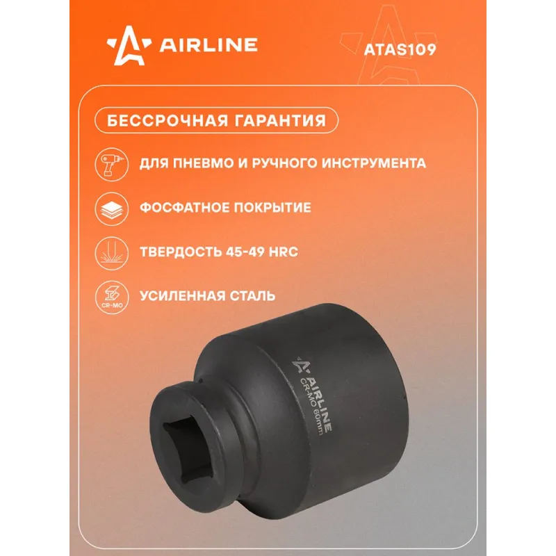 Головка ударная торцевая 1"DR шестигранная 60 мм L=90 мм Описание: Головка ударная торцевая 1" DR шестигранная 90 мм ATAS109 бренда AIRLINE Головка рассчитана на использование совместно с пневматическим гайковёртом и усилителем крутящего момента. - Материал - сталь 42CrMo; - Твердость - 45-49 HRC; - Покрытие - фосфатирование; - Материал обеспечивает стойкость к высоким нагрузкам. - Ударные головки для гайковерта, электроинструмента, пневмогайковерта, ручного инструмента и шуруповерта облегчат выполняемые задач. - В корпусе есть сквозное отверстие под штифт. Применение головки: при сборке и разборке узлов автомобиля, для монтажа и демонтажа колес легковых и грузовых автомобилей, в шиномонтажах, автосервисе, СТО. Рекомендуется для профессионального использования. Ударная торцевая головка дополнит набор инструментов для автомобиля который удобно хранить в багажнике машины, гараже, дома, а также легко транспортировать. Ударные головки значительно облегчают ремонт автомобиля и сокращают затраченное время на работу. Профессиональный набор инструментов для автомобиля, дома это отличный вариант для подарка мужчине, мужу, дедушке, автомобилисту, на день рождения, новый год, 23 февраля и без повода. Характеристики: Артикул: ATAS109 Длина, мм: 90 Размер, мм: 60 Присоединительный квадрат: 1"DR Комплектация: Головка торцевая - 1 шт Гарантия: от 1 года.