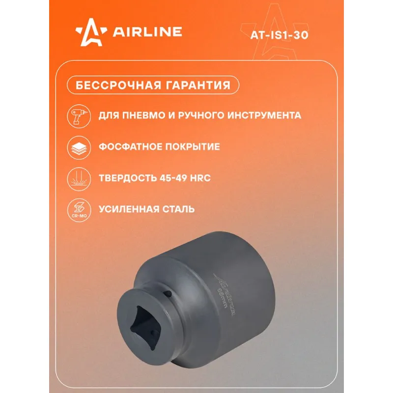 Головка ударная торцевая 1"DR шестигранная 65мм L=100мм Описание: Головка ударная торцевая 1" DR шестигранная 100 мм AT-IS1-30 бренда AIRLINE Головка рассчитана на использование совместно с пневматическим гайковёртом и усилителем крутящего момента. - Материал - сталь 40Cr; - Твердость - 40-43 HRC; - Покрытие - фосфатирование; - Материал обеспечивает стойкость к высоким нагрузкам. - Ударные головки для гайковерта, электроинструмента, пневмогайковерта, ручного инструмента и шуруповерта облегчат выполняемые задач. - В корпусе есть сквозное отверстие под штифт. Применение головки: при сборке и разборке узлов автомобиля, для монтажа и демонтажа колес легковых и грузовых автомобилей, в шиномонтажах, автосервисе, СТО. Рекомендуется для профессионального использования. Ударная торцевая головка дополнит набор инструментов для автомобиля который удобно хранить в багажнике машины, гараже, дома, а также легко транспортировать. Ударные головки значительно облегчают ремонт автомобиля и сокращают затраченное время на работу. Профессиональный набор инструментов для автомобиля, дома это отличный вариант для подарка мужчине, мужу, дедушке, автомобилисту, на день рождения, новый год, 23 февраля и без повода. Характеристики: Артикул: AT-IS1-30 Длина, мм: 100 Размер, мм: 65 Присоединительный квадрат: 1"DR Комплектация: Головка торцевая - 1 шт Гарантия: от 1 года.