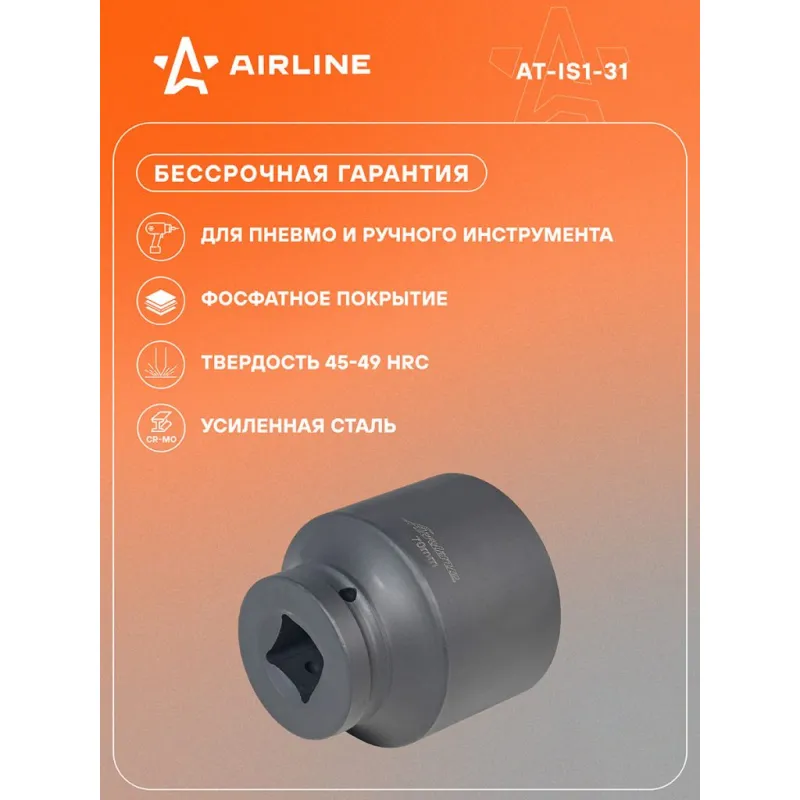 Головка ударная торцевая 1"DR шестигранная 70мм L=100мм Описание: Головка ударная торцевая 1" DR шестигранная 100 мм AT-IS1-31 бренда AIRLINE Головка рассчитана на использование совместно с пневматическим гайковёртом и усилителем крутящего момента. - Материал - сталь 40Cr; - Твердость - 40-43 HRC; - Покрытие - фосфатирование; - Материал обеспечивает стойкость к высоким нагрузкам. - Ударные головки для гайковерта, электроинструмента, пневмогайковерта, ручного инструмента и шуруповерта облегчат выполняемые задач. - В корпусе есть сквозное отверстие под штифт. Применение головки: при сборке и разборке узлов автомобиля, для монтажа и демонтажа колес легковых и грузовых автомобилей, в шиномонтажах, автосервисе, СТО. Рекомендуется для профессионального использования. Ударная торцевая головка дополнит набор инструментов для автомобиля который удобно хранить в багажнике машины, гараже, дома, а также легко транспортировать. Ударные головки значительно облегчают ремонт автомобиля и сокращают затраченное время на работу. Профессиональный набор инструментов для автомобиля, дома это отличный вариант для подарка мужчине, мужу, дедушке, автомобилисту, на день рождения, новый год, 23 февраля и без повода. Характеристики: Артикул: AT-IS1-31 Длина, мм: 100 Размер, мм: 70 Присоединительный квадрат: 1"DR Комплектация: Головка торцевая - 1 шт Гарантия: от 1 года.