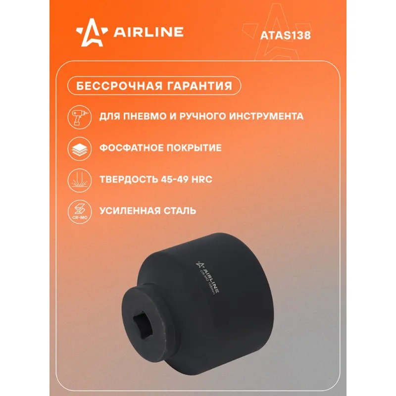 Головка ударная торцевая 1" шестигранная 105мм, L=120мм Описание: Головка ударная торцевая 1" DR шестигранная ATAS138 бренда AIRLINE Головка рассчитана на использование совместно с пневматическим гайковёртом и усилителем крутящего момента. - Материал - сталь 42CrMo; - Твердость - 45-49 HRC; - Покрытие - фосфатирование; - Материал обеспечивает стойкость к высоким нагрузкам. - Ударные головки для гайковерта, электроинструмента, пневмогайковерта, ручного инструмента и шуруповерта облегчат выполняемые задач. - В корпусе есть сквозное отверстие под штифт. Применение головки: при сборке и разборке узлов автомобиля, для монтажа и демонтажа колес легковых и грузовых автомобилей, в шиномонтажах, автосервисе, СТО. Рекомендуется для профессионального использования. Ударная торцевая головка дополнит набор инструментов для автомобиля который удобно хранить в багажнике машины, гараже, дома, а также легко транспортировать. Ударные головки значительно облегчают ремонт автомобиля и сокращают затраченное время на работу. Профессиональный набор инструментов для автомобиля, дома это отличный вариант для подарка мужчине, мужу, дедушке, автомобилисту, на день рождения, новый год, 23 февраля и без повода. Характеристики: Артикул: ATAS138 Присоединительный квадрат: 1" Размер,мм: 105 Длина,мм: 120 Комплектация: Головка - 1 шт Гарантия: от 1 года.