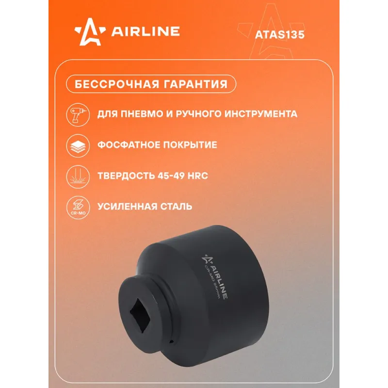Головка ударная торцевая 1" шестигранная 95мм, L=110мм Описание: Головка ударная торцевая 1" DR шестигранная ATAS135 бренда AIRLINE Головка рассчитана на использование совместно с пневматическим гайковёртом и усилителем крутящего момента. - Материал - сталь 42CrMo; - Твердость - 45-49 HRC; - Покрытие - фосфатирование; - Материал обеспечивает стойкость к высоким нагрузкам. - Ударные головки для гайковерта, электроинструмента, пневмогайковерта, ручного инструмента и шуруповерта облегчат выполняемые задач. - В корпусе есть сквозное отверстие под штифт. Применение головки: при сборке и разборке узлов автомобиля, для монтажа и демонтажа колес легковых и грузовых автомобилей, в шиномонтажах, автосервисе, СТО. Рекомендуется для профессионального использования. Ударная торцевая головка дополнит набор инструментов для автомобиля который удобно хранить в багажнике машины, гараже, дома, а также легко транспортировать. Ударные головки значительно облегчают ремонт автомобиля и сокращают затраченное время на работу. Профессиональный набор инструментов для автомобиля, дома это отличный вариант для подарка мужчине, мужу, дедушке, автомобилисту, на день рождения, новый год, 23 февраля и без повода. Характеристики: Артикул: ATAS135 Присоединительный квадрат: 1" Размер,мм: 95 Длина,мм: 110 Комплектация: Головка - 1 шт Гарантия: от 1 года.