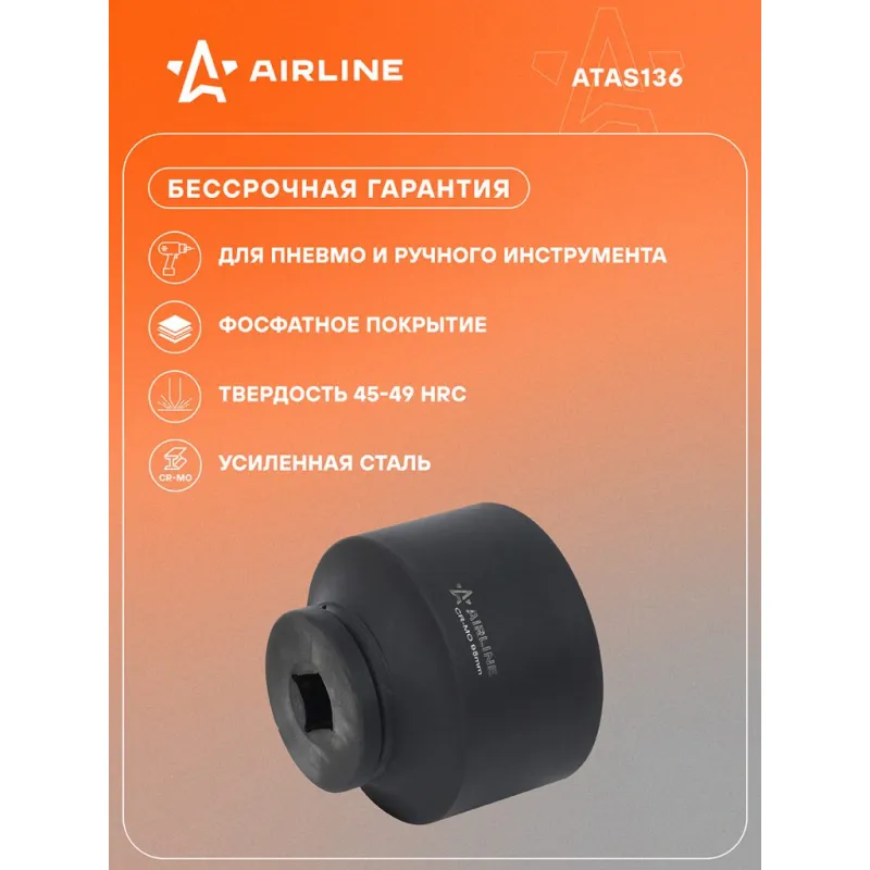 Головка ударная торцевая 1" шестигранная 98мм, L=110мм Описание: Головка ударная торцевая 1" DR шестигранная ATAS136 бренда AIRLINE Головка рассчитана на использование совместно с пневматическим гайковёртом и усилителем крутящего момента. - Материал - сталь 42CrMo; - Твердость - 45-49 HRC; - Покрытие - фосфатирование; - Материал обеспечивает стойкость к высоким нагрузкам. - Ударные головки для гайковерта, электроинструмента, пневмогайковерта, ручного инструмента и шуруповерта облегчат выполняемые задач. - В корпусе есть сквозное отверстие под штифт. Применение головки: при сборке и разборке узлов автомобиля, для монтажа и демонтажа колес легковых и грузовых автомобилей, в шиномонтажах, автосервисе, СТО. Рекомендуется для профессионального использования. Ударная торцевая головка дополнит набор инструментов для автомобиля который удобно хранить в багажнике машины, гараже, дома, а также легко транспортировать. Ударные головки значительно облегчают ремонт автомобиля и сокращают затраченное время на работу. Профессиональный набор инструментов для автомобиля, дома это отличный вариант для подарка мужчине, мужу, дедушке, автомобилисту, на день рождения, новый год, 23 февраля и без повода. Характеристики: Артикул: ATAS136 Присоединительный квадрат: 1" Размер,мм: 98 Длина,мм: 110 Комплектация: Головка - 1 шт Гарантия: от 1 года.