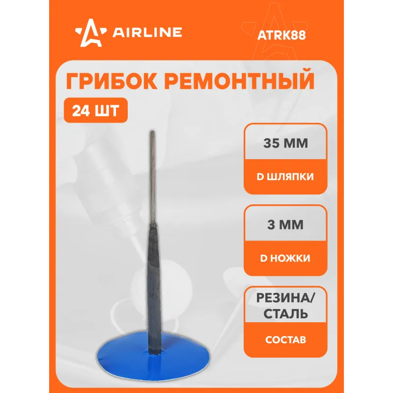 Грибок ремонтный 605 (диаметр ножки 3 мм, диаметр шляпки 35 мм) Описание: Для ремонта проколов и порезов радиальных и диагональных шин (до 25°) Характеристики: Артикул: ATRK88 Диаметр шляпки, мм: 35 Диаметр ножки, мм: 3 Тип вулканизации: Холодная Комплектация: Грибок для б/к шин ремонтный - 1 шт Гарантия: от 1 года.