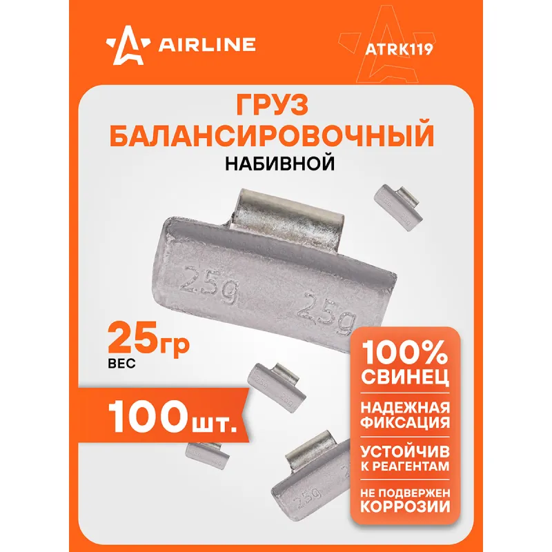 Груз балансировочный свинцовый для литых дисков 25 гр, 100 шт. Описание: Грузики для балансировки колес 100 шт, 25 грамм для автомобиля для мотоцикла для литых дисков AIRLINE ATRK119. Свинцовый набивной грузик, используется для балансировки колес с легкосплавным литым диском. Балансировочные груза это подвесы, которые используют при проведении балансировочных работы с колесом автомобиля с литыми дисками или штампованными (стальными) дисками. Данный процесс помогает защитить поверхность резины колеса от раннего износа, улучшить сцепление, снизить нагрузку, которая приходится на подшипники и амортизаторы. Применение: Свинцовые грузы приклеиваются на внутреннюю поверхность обода диска, когда конструкция обода не позволяет разместить грузики для литых дисков с крепежной скобой. Благодаря свойствам металла, груз не подвержен коррозии, устойчив к химическим реагентам. Грузики самоклеящиеся для шиномонтажа. При помощи грузиков балансировочных устраняется дисбаланс и как следствие биение колёс. Преимущества: *не подвержены коррозии; *удобная фасовка; *точный вес грузиков для шиномонтажа; В линейке AIRLINE, вы найдете широкий ассортимент высококачественных автотоваров и средств по уходу за вашим автомобилем, качественные грузила из свинца, грузики балансировочные самоклеящиеся. Мы гарантируем качество и надежность наших товаров. Характеристики: Артикул: ATRK119 Материал: свинец Тип: набивной Вес, гр: 25 Комплектация: Грузики, 25 гр - 100 шт Гарантия: от 1 года.