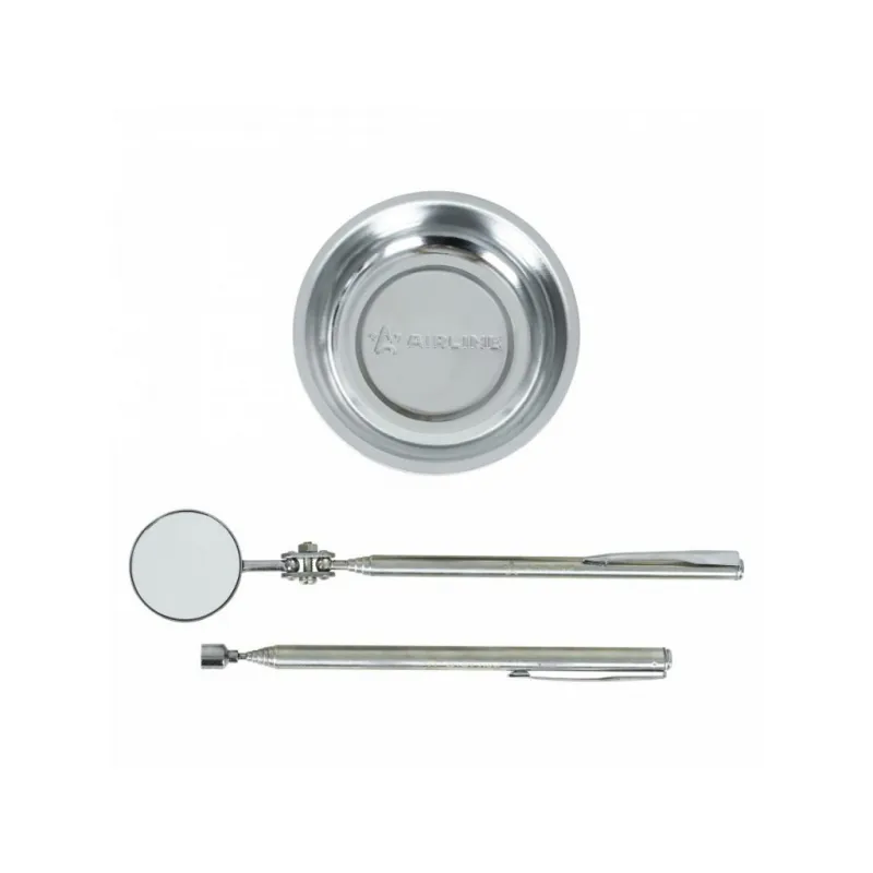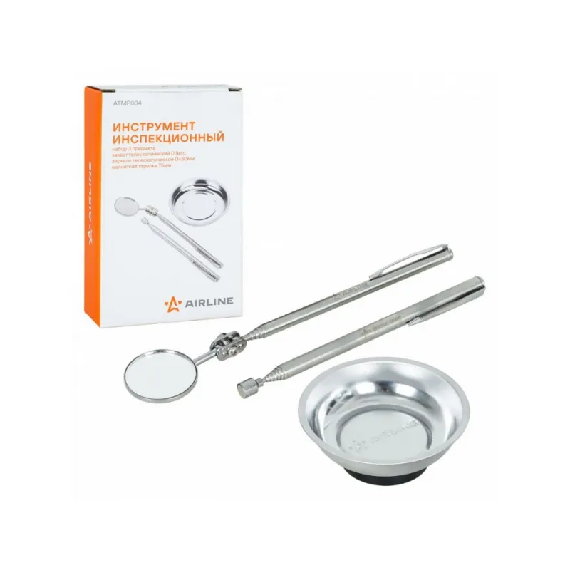 Инструмент инспекционный, набор 3пр. (захват телеск. 0.5кгс, зеркало телеск. D=30мм, магнит.тарелка 75мм) Описание: Инструмент инспекционный, набор 3пр. (захват телескоп., зеркало телескоп., магнитная тарелка), предназначен для удобной работы с мелкими металлическими деталями, такими как гайки, болты, шайбы и винты. Этот комплект станет незаменимым помощником в автомастерских, сервисных центрах и домашних условиях. Характеристики: Артикул: ATMP034 Размер, мм: 75 Max длина, мм: 500 Материал магнита: Феррит Сила магнита, кгс: 0.5 Диаметр: 30 Комплектация: Захват телескопический магнитный - 1 шт Тарелка магнитная - 1 шт Зеркало телескопическое круглое - 1 шт Гарантия: от 1 года.