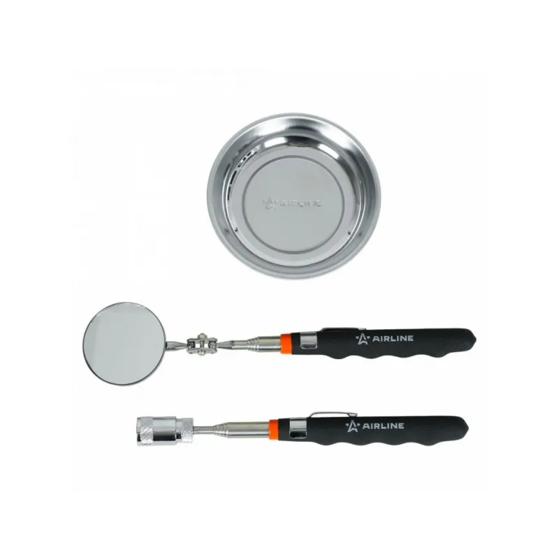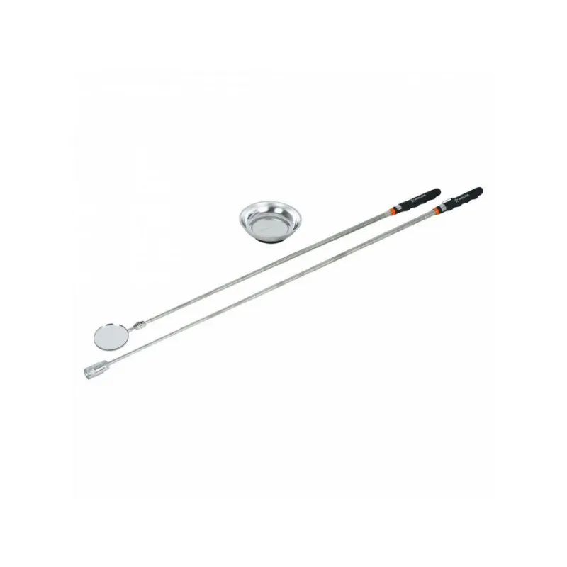 Инструмент инспекционный, набор 3пр. (захват телеск. c подсветкой 2.2кгс, зеркало телеск. D=50мм, магнит.тарелка 108мм) Описание: Инструмент инспекционный, набор 3пр. (захват телескоп. с подсветкой, зеркало телескоп., магнитная тарелка), предназначен для удобной работы с мелкими металлическими деталями, такими как гайки, болты, шайбы и винты. Этот комплект станет незаменимым помощником в автомастерских, сервисных центрах и домашних условиях. Характеристики: Артикул: ATMP031 Размер, мм: 108 Материал магнита: Феррит Сила магнита, кгс: 2,2 Диаметр: 50 Элемент питания: LR44 Max длина, мм: 810 Комплектация: Захват телескопический магнитный - 1 шт Тарелка магнитная - 1 шт Зеркало телескопическое круглое - 1 шт Гарантия: от 1 года.