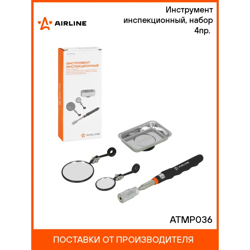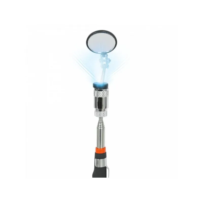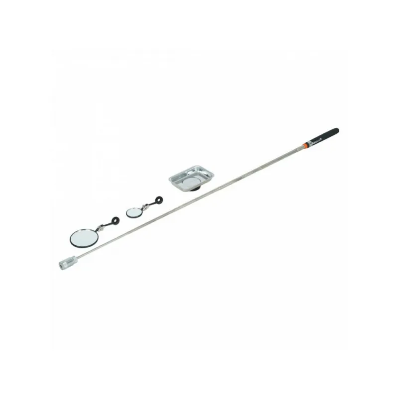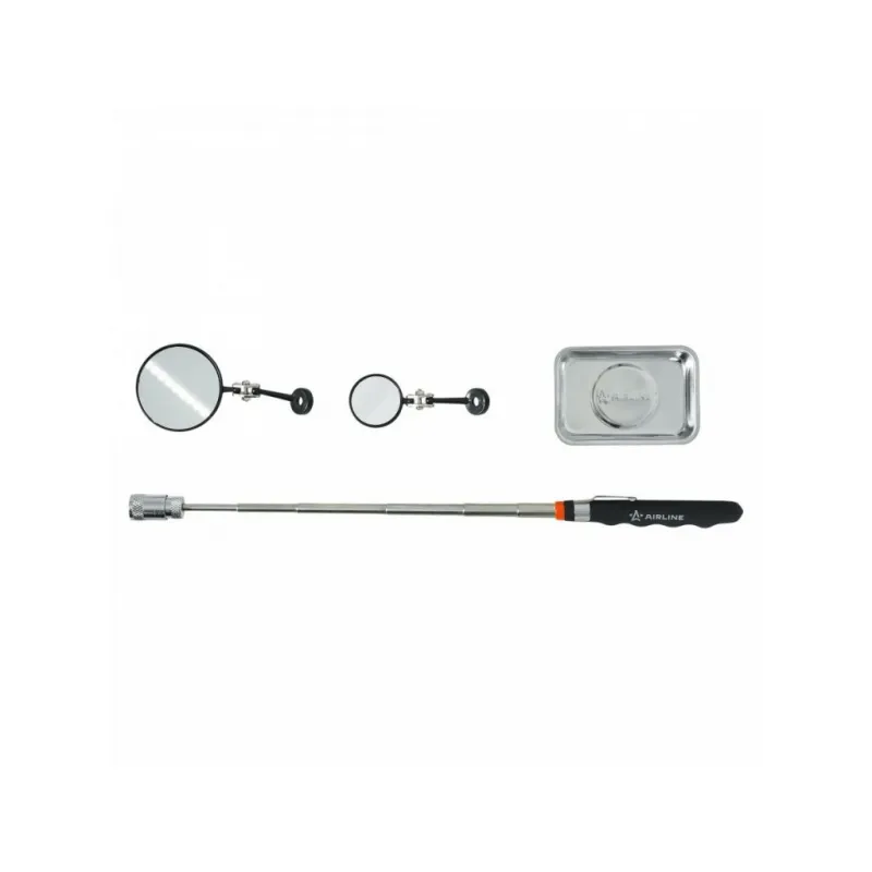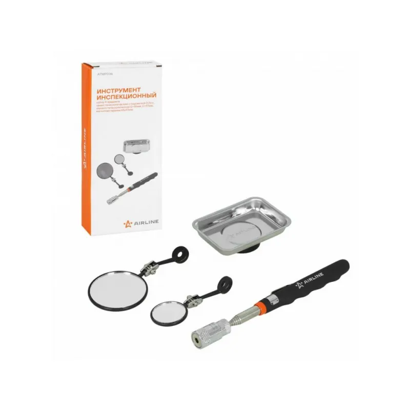 Инструмент инспекционный, набор 4пр. (захват телеск. с подсвет. 2.2кгс, зеркало телеск. D35, 57мм 2шт., магнит.тарелка 64х93мм) Описание: Инструмент инспекционный, набор 4пр. (захват телескоп. с подсветкой, зеркало телескоп., 2шт., магнитная тарелка), предназначен для удобной работы с мелкими металлическими деталями, такими как гайки, болты, шайбы и винты. Этот комплект станет незаменимым помощником в автомастерских, сервисных центрах и домашних условиях. Характеристики: Артикул: ATMP036 Размер, мм: 64х93 Элемент питания: LR44 Max длина, мм: 800 Материал магнита: Феррит Сила магнита, кгс: 2,2 Диаметр: 35, 57 Комплектация: Захват телескопический магнитный - 1 шт Тарелка магнитная - 1 шт Зеркало телескопическое круглое - 2 шт Гарантия: от 1 года.