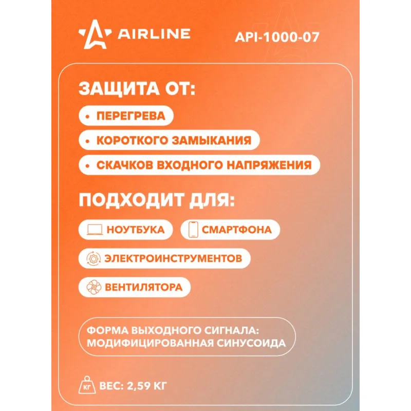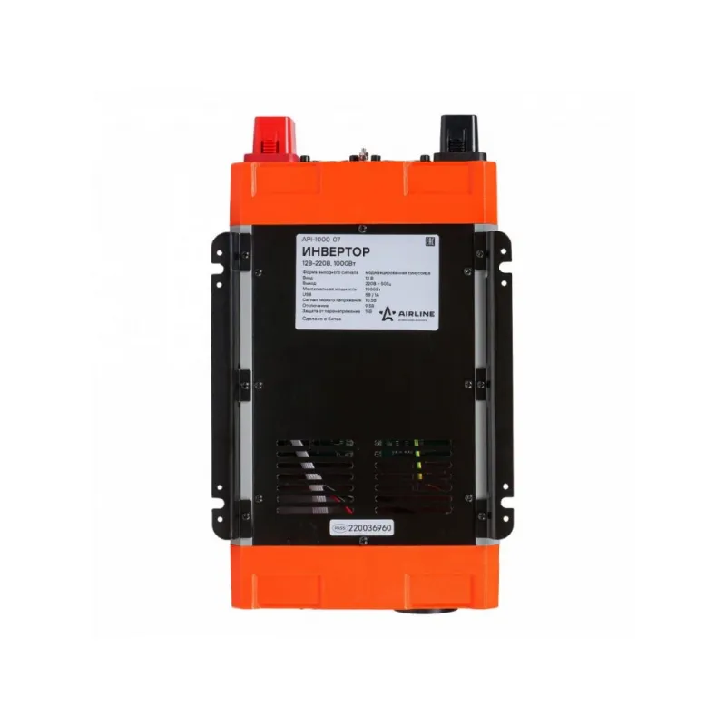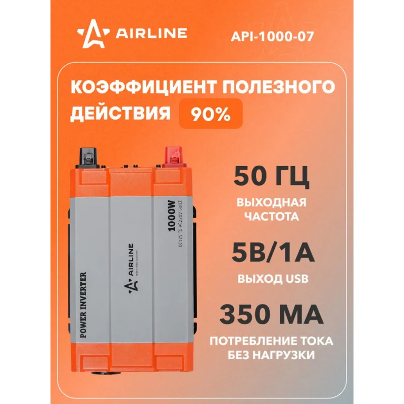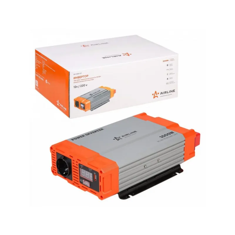 Инвертор автомобильный 12В-220В, 1000 Вт Описание: Инвертор автомобильный 12 В 220 В 1000 Вт + USB AIRLINE API-1000-07 Автомобильные преобразователи напряжения (инверторы) позволяют получить переменное напряжение 220 В – 50Гц от аккумулятора автомобиля. Инверторы предназначены для питания устройств с номинальным напряжением 220 В. Особенности: * Автоотключение при снижении входного напряжения; * Защита от перенапряжения; * Защита от перегрузки и перегрева; * Защита от короткого замыкания; * Модифицированная синусоида; * Мягкий старт; * Эффективность более 90 %; * Авто восстановление; В инверторы встроено гнездо USB 5В/1А для питания и зарядки мобильных устройств. Устройства имеют защиты от короткого замыкания, перегрева, бросков входного напряжения. После устранения причины включения защиты инвертор автоматически восстанавливает свою работу. Если в автомобиле необходима настоящая розетка 220 В, то инвертор станет незаменимым дополнением. Подключаясь к аккумулятору, он инвертирует автомобильные 12 В в 220 В, обеспечивая автовладельца возможностью подключения необходимых в дороге или на выезде, вдалеке от дома, приборов, например, ноутбука и телевизора, электроинструментов и зарядки. Это делает автомобиль более комфортным, особенно в случае внепланового отключения электроэнергии дома, на даче или на отдыхе за городом. Товар официального производителя AIRLINE. Автотовар, который станет отличным подарком автомобилисту, мужчине и женщине, автолюбителю, папе, отцу, мужу, парню и другу, так как может быть использован в автобусе, грузовике, автомобиле, рыбалке, в поездках на отдых, в кемпинге и т.д. Характеристики: Артикул: API-1000-07 Выходное напряжение, В: 220 Входное напряжение, В: 12 Мощность (длительная), Вт: 1000 Пиковая мощность, Вт: 2000 Рабочая температура, С: -20-60 Нижний порог входного напряжения, В: 9,5 Верхний порог входного напряжения, В: 15 Потребление тока без нагрузки, мА: 500 Эффективность, %: >90% Форма выходного сигнала: Модифицированная синусоида Выход USB: 5В/1А Комплектация: Инвертор - 1 шт Соеденительные кабели - 2 шт Инструкция - 1 шт Коробка - 1 шт Гарантия: от 1 года.
