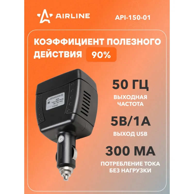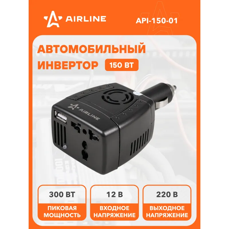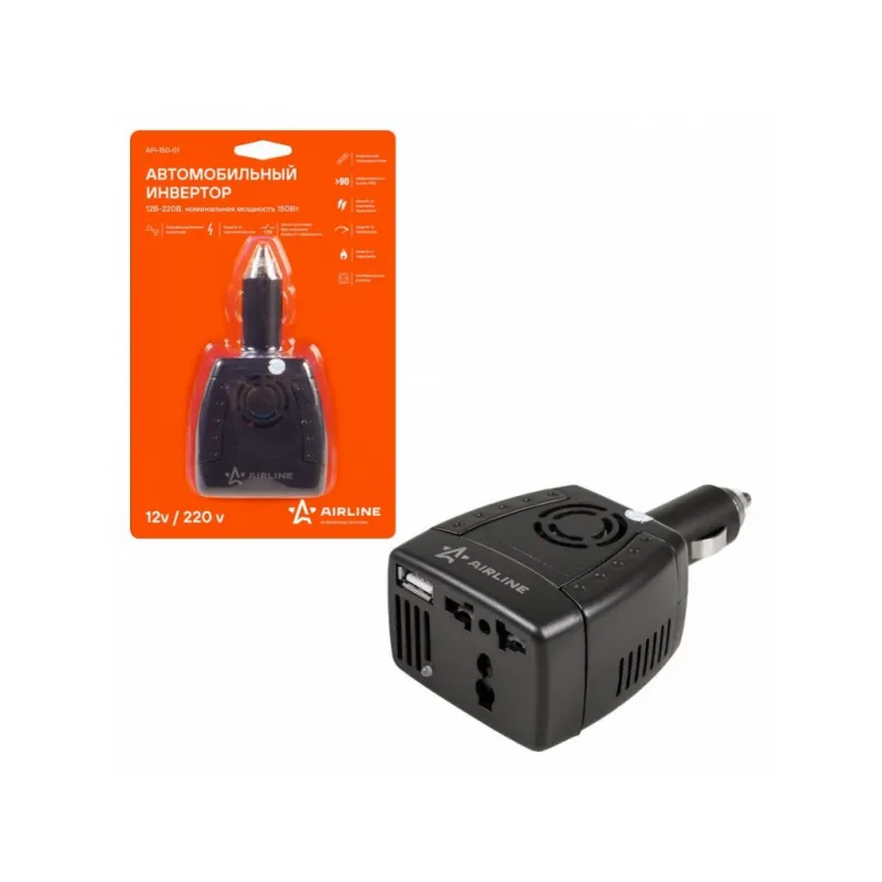 Инвертор автомобильный 12В-220В, 150 Вт Описание: Инвертор автомобильный 12 В 220 В 150 Вт + USB AIRLINE API-150-01 Автомобильные преобразователи напряжения (инверторы) позволяют получить переменное напряжение 220 В – 50Гц от прикуривателя. Инверторы предназначены для питания устройств с номинальным напряжением 220 В. Особенности: * Автоотключение при снижении входного напряжения; * Защита от перенапряжения; * Защита от перегрузки и перегрева; * Защита от короткого замыкания; * Модифицированная синусоида; * Встроенный предохранитель; * Эффективность более 90 %; * Универсальная розетка; В инверторы встроено гнездо USB 5В/1А для питания и зарядки мобильных устройств. Устройства имеют защиты от короткого замыкания, перегрева, бросков входного напряжения. После устранения причины включения защиты инвертор автоматически восстанавливает свою работу. Если в автомобиле необходима настоящая розетка 220 В, то инвертор станет незаменимым дополнением. Подключаясь к прикуривателю, он инвертирует автомобильные 12 В в 220 В, обеспечивая автовладельца возможностью подключения необходимых в дороге или на выезде, вдалеке от дома, приборов, например, ноутбука и телевизора, электроинструментов и зарядки. Это делает автомобиль более комфортным, особенно в случае внепланового отключения электроэнергии дома, на даче или на отдыхе за городом. Товар официального производителя AIRLINE. Автотовар, который станет отличным подарком автомобилисту, мужчине и женщине, автолюбителю, папе, отцу, мужу, парню и другу, так как может быть использован в автобусе, грузовике, автомобиле, рыбалке, в поездках на отдых, в кемпинге и т.д. Характеристики: Артикул: API-150-01 Выходное напряжение, В: 220 Входное напряжение, В: 12 Мощность (длительная), Вт: 150 Пиковая мощность, Вт: 300 Рабочая температура, С: -20-40 Нижний порог входного напряжения, В: 10 Верхний порог входного напряжения, В: 14,8 Потребление тока без нагрузки, мА: 300 Эффективность, %: >90 Форма выходного сигнала: Модифицированная синусоида Выход USB: 5В/1А Предохранитель:: 1x20A Комплектация: Инвертор в блистере - 1 шт Гарантия: от 1 года.