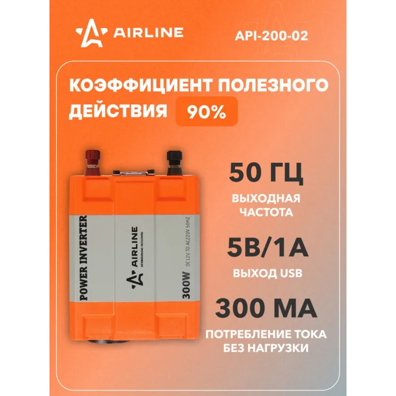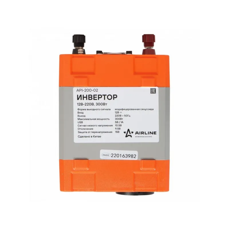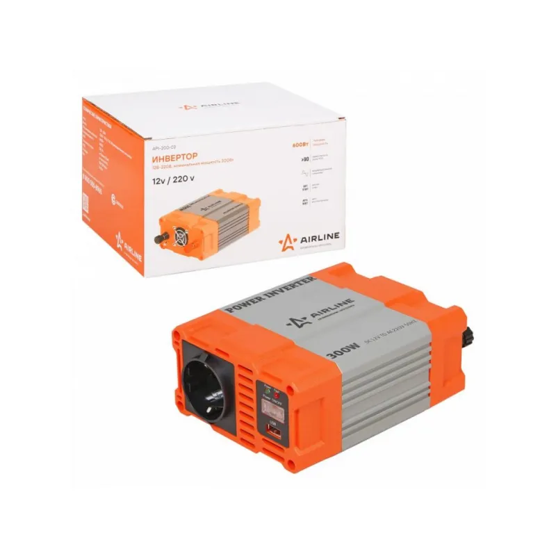 Инвертор автомобильный 12В-220В, 300 Вт Описание: Инвертор автомобильный 12 В 220 В 300 Вт + USB AIRLINE API-200-02 Автомобильные преобразователи напряжения (инверторы) позволяют получить переменное напряжение 220 В – 50Гц от аккумулятора автомобиля. Инверторы предназначены для питания устройств с номинальным напряжением 220 В. Особенности: * Автоотключение при снижении входного напряжения; * Защита от перенапряжения; * Защита от перегрузки и перегрева; * Защита от короткого замыкания; * Модифицированная синусоида; * Мягкий старт; * Эффективность более 90 %; * Авто восстановление; В инверторы встроено гнездо USB 5В/1А для питания и зарядки мобильных устройств. Устройства имеют защиты от короткого замыкания, перегрева, бросков входного напряжения. После устранения причины включения защиты инвертор автоматически восстанавливает свою работу. Если в автомобиле необходима настоящая розетка 220 В, то инвертор станет незаменимым дополнением. Подключаясь к аккумулятору, он инвертирует автомобильные 12 В в 220 В, обеспечивая автовладельца возможностью подключения необходимых в дороге или на выезде, вдалеке от дома, приборов, например, ноутбука и телевизора, электроинструментов и зарядки. Это делает автомобиль более комфортным, особенно в случае внепланового отключения электроэнергии дома, на даче или на отдыхе за городом. Товар официального производителя AIRLINE. Автотовар, который станет отличным подарком автомобилисту, мужчине и женщине, автолюбителю, папе, отцу, мужу, парню и другу, так как может быть использован в автобусе, грузовике, автомобиле, рыбалке, в поездках на отдых, в кемпинге и т.д. Характеристики: Артикул: API-200-02 Выходное напряжение, В: 220 Входное напряжение, В: 12 Мощность (длительная), Вт: 300 Пиковая мощность, Вт: 600 Рабочая температура, С: -20-40 Нижний порог входного напряжения, В: 9,5 Верхний порог входного напряжения, В: 15 Потребление тока без нагрузки, мА: 300 Эффективность, %: >90 Форма выходного сигнала: Модифицированная синусоида Выход USB: 5В/1А Комплектация: Инвертор - 1 шт Соеденительные кабели - 2 шт Инструкция - 1 шт Коробка - 1 шт Гарантия: от 1 года.