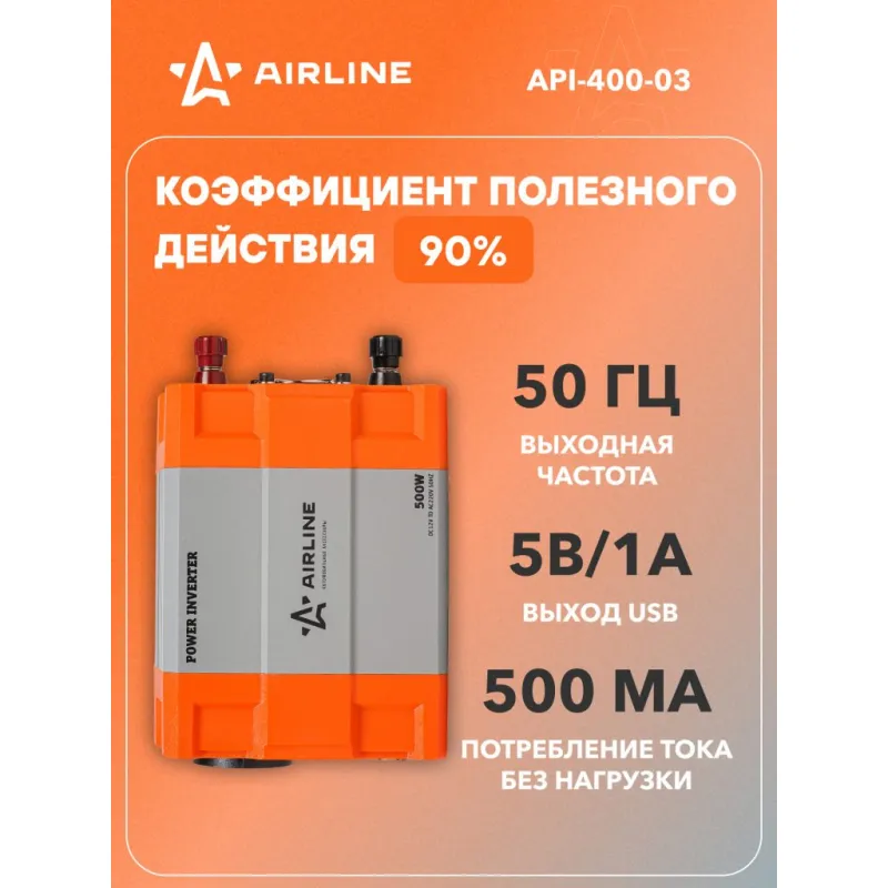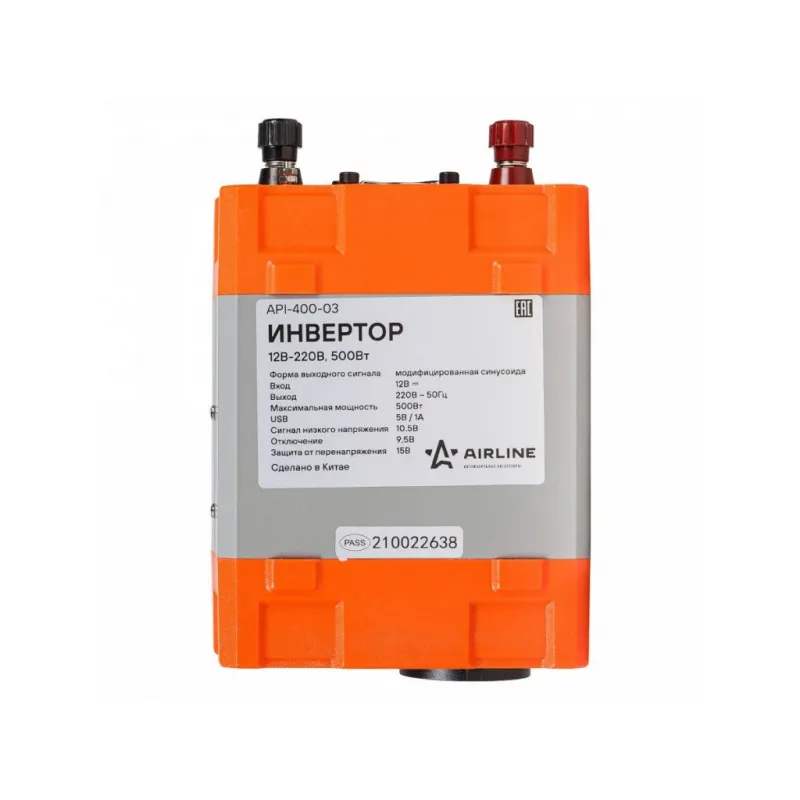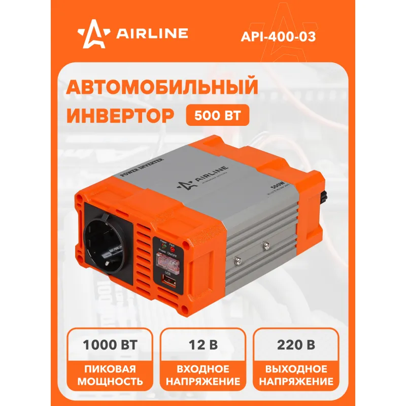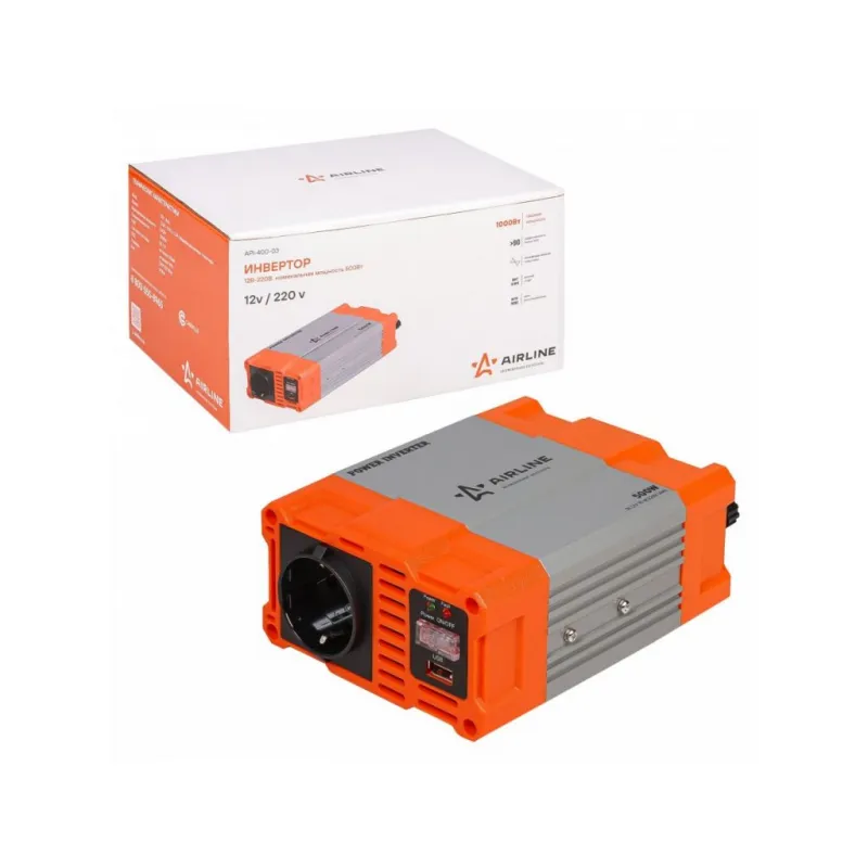Инвертор автомобильный 12В-220В, 500 Вт Описание: Инвертор автомобильный 12 В 220 В 500 Вт + USB AIRLINE API-400-03 Автомобильные преобразователи напряжения (инверторы) позволяют получить переменное напряжение 220 В – 50Гц от аккумулятора автомобиля. Инверторы предназначены для питания устройств с номинальным напряжением 220 В. Особенности: * Автоотключение при снижении входного напряжения; * Защита от перенапряжения; * Защита от перегрузки и перегрева; * Защита от короткого замыкания; * Модифицированная синусоида; * Мягкий старт; * Эффективность более 90 %; * Авто восстановление; В инверторы встроено гнездо USB 5В/1А для питания и зарядки мобильных устройств. Устройства имеют защиты от короткого замыкания, перегрева, бросков входного напряжения. После устранения причины включения защиты инвертор автоматически восстанавливает свою работу. Если в автомобиле необходима настоящая розетка 220 В, то инвертор станет незаменимым дополнением. Подключаясь к аккумулятору, он инвертирует автомобильные 12 В в 220 В, обеспечивая автовладельца возможностью подключения необходимых в дороге или на выезде, вдалеке от дома, приборов, например, ноутбука и телевизора, электроинструментов и зарядки. Это делает автомобиль более комфортным, особенно в случае внепланового отключения электроэнергии дома, на даче или на отдыхе за городом. Товар официального производителя AIRLINE. Автотовар, который станет отличным подарком автомобилисту, мужчине и женщине, автолюбителю, папе, отцу, мужу, парню и другу, так как может быть использован в автобусе, грузовике, автомобиле, рыбалке, в поездках на отдых, в кемпинге и т.д. Характеристики: Артикул: API-400-03 Выходное напряжение, В: 220 Входное напряжение, В: 12 Мощность (длительная), Вт: 500 Пиковая мощность, Вт: 1000 Рабочая температура, С: -20-40 Нижний порог входного напряжения, В: 10,5 Верхний порог входного напряжения, В: 15 Потребление тока без нагрузки, мА: 500 Эффективность, %: >90 Форма выходного сигнала: Модифицированная синусоида Выход USB: 5В/1А Комплектация: Инвертор - 1 шт Соеденительные кабели - 2 шт Инструкция - 1 шт Коробка - 1 шт Гарантия: от 1 года.