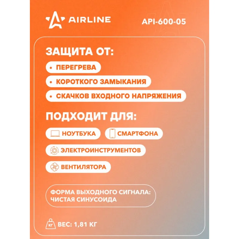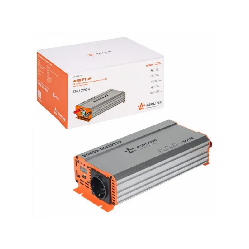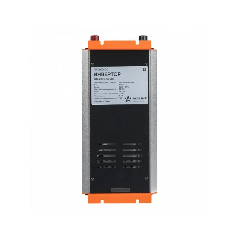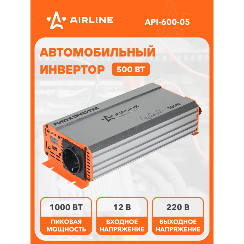 Инвертор автомобильный 12В-220В, 500 Вт чистый синус Описание: Инвертор автомобильный 12 В 220 В 500 Вт + USB AIRLINE API-600-05 Автомобильные преобразователи напряжения (инверторы) позволяют получить переменное напряжение 220 В – 50Гц от аккумулятора автомобиля. Инверторы предназначены для питания устройств с номинальным напряжением 220 В. Особенности: * Автоотключение при снижении входного напряжения; * Защита от перенапряжения; * Защита от перегрузки и перегрева; * Защита от короткого замыкания; * Модифицированная синусоида; * Мягкий старт; * Эффективность более 90 %; * Авто восстановление; В инверторы встроено гнездо USB 5В/1А для питания и зарядки мобильных устройств. Устройства имеют защиты от короткого замыкания, перегрева, бросков входного напряжения. После устранения причины включения защиты инвертор автоматически восстанавливает свою работу. Если в автомобиле необходима настоящая розетка 220 В, то инвертор станет незаменимым дополнением. Подключаясь к аккумулятору, он инвертирует автомобильные 12 В в 220 В, обеспечивая автовладельца возможностью подключения необходимых в дороге или на выезде, вдалеке от дома, приборов, например, ноутбука и телевизора, электроинструментов и зарядки. Это делает автомобиль более комфортным, особенно в случае внепланового отключения электроэнергии дома, на даче или на отдыхе за городом. Товар официального производителя AIRLINE. Автотовар, который станет отличным подарком автомобилисту, мужчине и женщине, автолюбителю, папе, отцу, мужу, парню и другу, так как может быть использован в автобусе, грузовике, автомобиле, рыбалке, в поездках на отдых, в кемпинге и т.д. Характеристики: Артикул: API-600-05 Выходное напряжение, В: 220 Входное напряжение, В: 12 Мощность (длительная), Вт: 500 Пиковая мощность, Вт: 1000 Рабочая температура, С: -20-40 Нижний порог входного напряжения, В: 10 Верхний порог входного напряжения, В: 14,8 Потребление тока без нагрузки, мА: 300 Эффективность, %: >90 Форма выходного сигнала: Истиная синусоида Выход USB: 5В/1А Комплектация: Инвертор - 1 шт Соеденительные кабели - 2 шт Инструкция - 1 шт Коробка - 1 шт Гарантия: от 1 года.