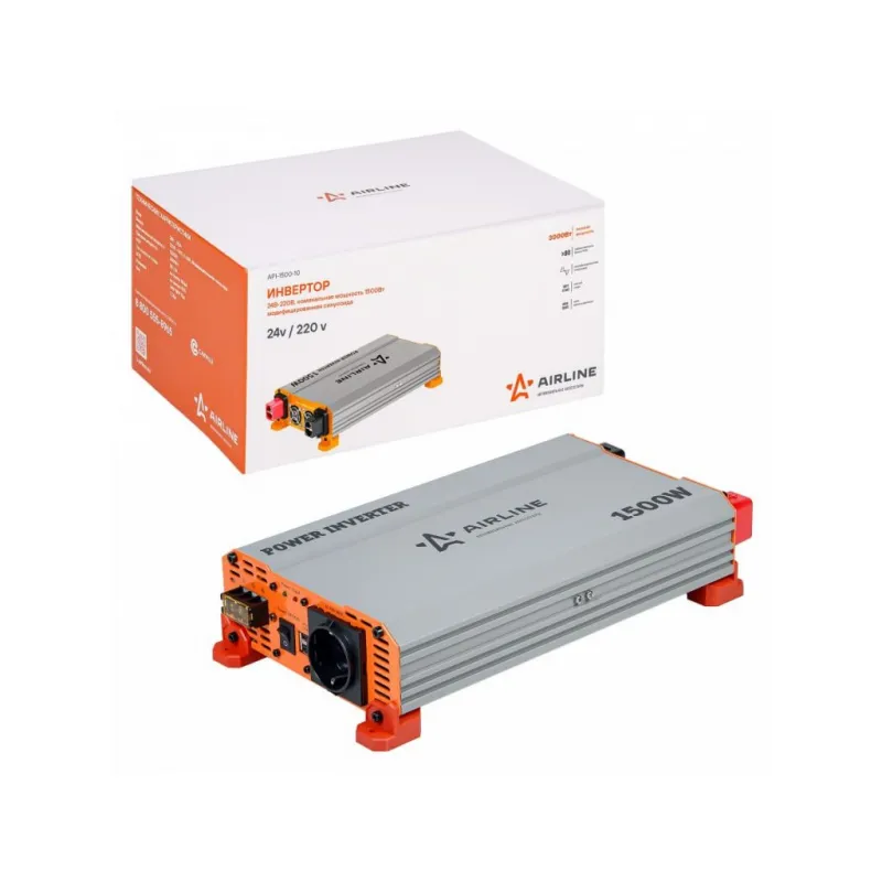 Инвертор автомобильный 24В-220В, 1500 Вт Описание: Инвертор автомобильный 24 В 220 В 1500 Вт + USB AIRLINE API-1500-10 Автомобильные преобразователи напряжения (инверторы) позволяют получить переменное напряжение 220 В – 50Гц от аккумулятора автомобиля. Инверторы предназначены для питания устройств с номинальным напряжением 220 В. Особенности: * Автоотключение при снижении входного напряжения; * Защита от перенапряжения; * Защита от перегрузки и перегрева; * Защита от короткого замыкания; * Модифицированная синусоида; * Мягкий старт; * Эффективность более 90 %; * Авто восстановление; В инверторы встроено гнездо USB 5В/1А для питания и зарядки мобильных устройств. Устройства имеют защиты от короткого замыкания, перегрева, бросков входного напряжения. После устранения причины включения защиты инвертор автоматически восстанавливает свою работу. Если в автомобиле необходима настоящая розетка 220 В, то инвертор станет незаменимым дополнением. Подключаясь к аккумулятору, он инвертирует автомобильные 24 В в 220 В, обеспечивая автовладельца возможностью подключения необходимых в дороге или на выезде, вдалеке от дома, приборов, например, ноутбука и телевизора, электроинструментов и зарядки. Это делает автомобиль более комфортным, особенно в случае внепланового отключения электроэнергии дома, на даче или на отдыхе за городом. Товар официального производителя AIRLINE. Автотовар, который станет отличным подарком автомобилисту, мужчине и женщине, автолюбителю, папе, отцу, мужу, парню и другу, так как может быть использован в автобусе, грузовике, автомобиле, рыбалке, в поездках на отдых, в кемпинге и т.д. Характеристики: Артикул: API-1500-10 Выходное напряжение, В: 220 Входное напряжение, В: 24 Мощность (длительная), Вт: 1500 Пиковая мощность, Вт: 3000 Рабочая температура, С: -20-60 Нижний порог входного напряжения, В: 19 Верхний порог входного напряжения, В: 30 Потребление тока без нагрузки, мА: 250 Эффективность, %: >90 Форма выходного сигнала: Модифицированная синусоида Выход USB: 5В/1А Комплектация: Инвертор - 1 шт Соеденительные кабели - 2 шт Инструкция - 1 шт Коробка - 1 шт Гарантия: от 1 года.