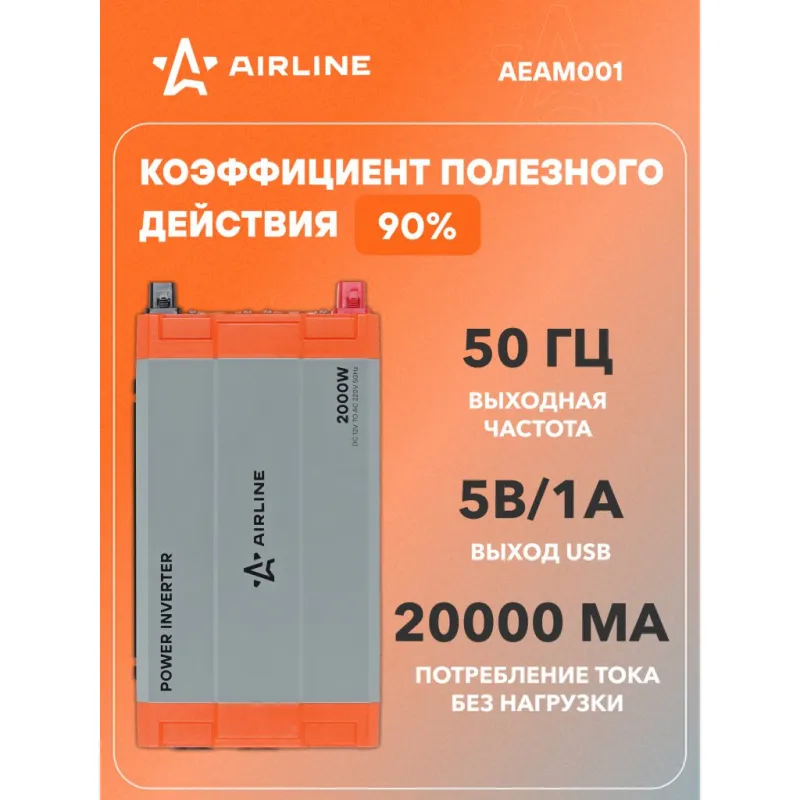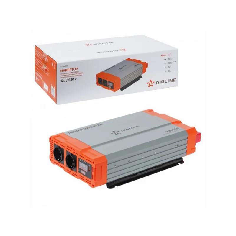Инвертор автомобильный 12В-220В, 2000 Вт Описание: Инвертор автомобильный 12 В 220 В 2000 Вт AIRLINE AEAM001 Автомобильные преобразователи напряжения (инверторы) позволяют получить переменное напряжение 220 В – 50Гц от аккумулятора автомобиля. Инверторы предназначены для питания устройств с номинальным напряжением 220 В. Особенности: * Автоотключение при снижении входного напряжения; * Защита от перенапряжения; * Защита от перегрузки и перегрева; * Защита от короткого замыкания; * Модифицированная синусоида; * Мягкий старт; * Эффективность более 90 %; * Авто восстановление; В инверторы встроено гнездо USB 5В/1А для питания и зарядки мобильных устройств. Устройства имеют защиты от короткого замыкания, перегрева, бросков входного напряжения. После устранения причины включения защиты инвертор автоматически восстанавливает свою работу. Если в автомобиле необходима настоящая розетка 220 В, то инвертор станет незаменимым дополнением. Подключаясь к аккумулятору, он инвертирует автомобильные 12 В в 220 В, обеспечивая автовладельца возможностью подключения необходимых в дороге или на выезде, вдалеке от дома, приборов, например, ноутбука и телевизора, электроинструментов и зарядки. Это делает автомобиль более комфортным, особенно в случае внепланового отключения электроэнергии дома, на даче или на отдыхе за городом. Товар официального производителя AIRLINE. Автотовар, который станет отличным подарком автомобилисту, мужчине и женщине, автолюбителю, папе, отцу, мужу, парню и другу, так как может быть использован в автобусе, грузовике, автомобиле, рыбалке, в поездках на отдых, в кемпинге и т.д. Характеристики: Артикул: AEAM001 Выход USB: 5В/1А Выходное напряжение, В: 220 Входное напряжение, В: 12 Мощность (длительная), Вт: 2000 Пиковая мощность, Вт: 4000 Рабочая температура, С: 0-40 Нижний порог входного напряжения, В: 9,5 Верхний порог входного напряжения, В: 15,5 Потребление тока без нагрузки, мА: 2000 Эффективность, %: >90 Форма выходного сигнала: Модифицированная синусоида Комплектация: Инвертор - 1 шт Соеденительные кабели - 2 шт Инструкция - 1 шт Коробка - 1 шт Гарантия: от 1 года.