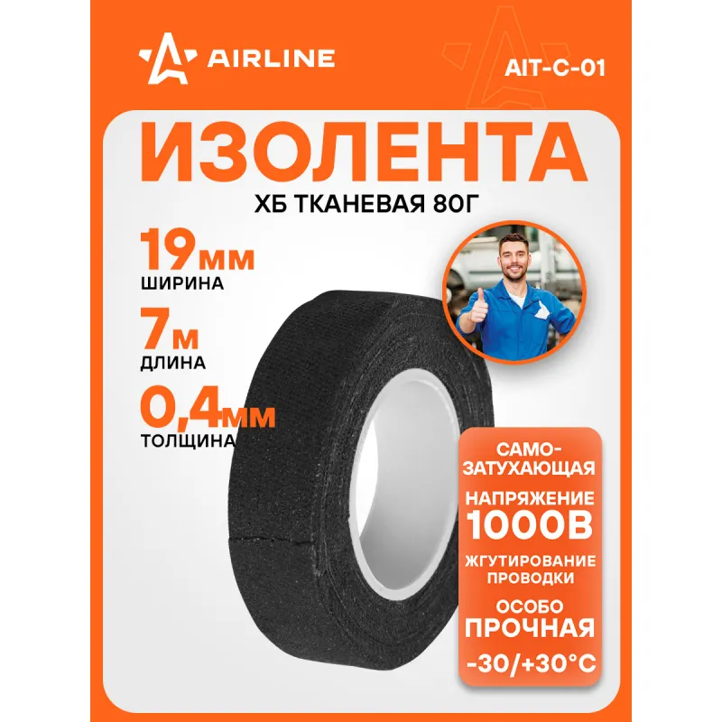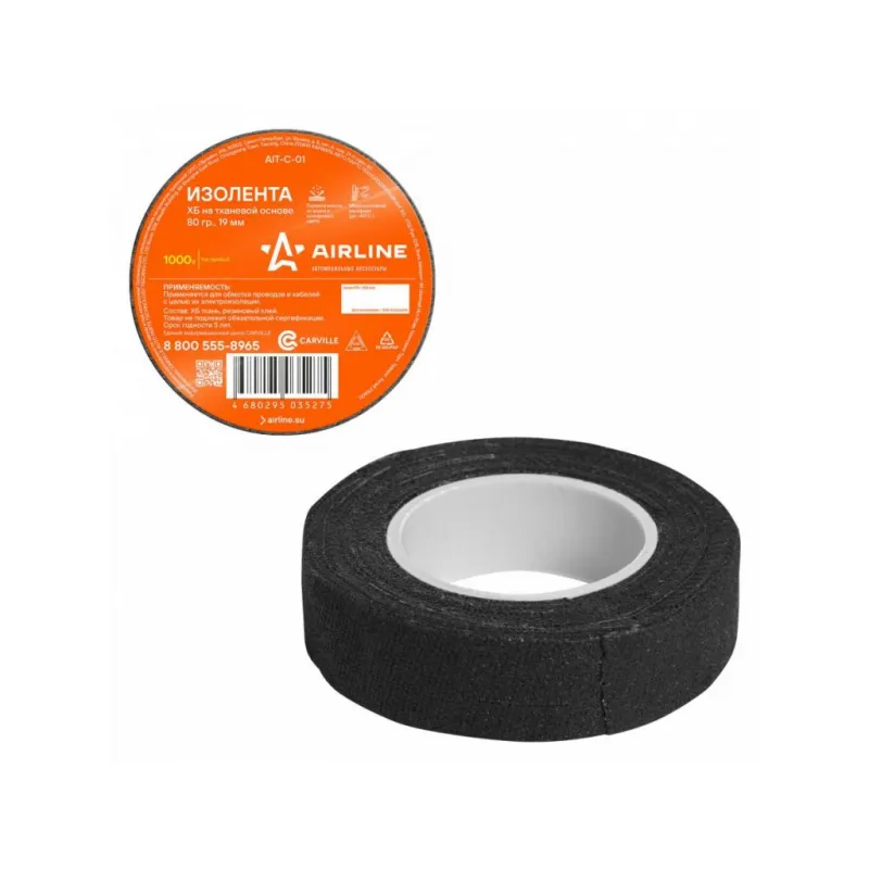 Изолента ХБ на тканевой основе, 80 г., прорезиненная, (19мм*0,4мм*7м), черная Описание: Изолента ХБ на тканевой основе, прорезиненная 7.0 мх19 мм AIRLINE AIT-C-01 - универсальное решение для разных задач, преимущественно используется для обвязки и изоляции проводов. Изолента ХБ на тканевой основе, которая является расходным материалом и предназначена для обмотки проводов и кабелей с целью их электроизоляции. Изолента AIRLINE представляет собой прорезиненную хлопчатобумажную текстильную ленту, имеющую клейкую поверхность. Её диэлектрические и изоляционные свойства ограничены значением до 1000 В; Касательно практического использования: у данного вида изоляционной ленты, существует такое достоинство, как использование ее в очень жарких и горячих местах. При сильном нагреве она не плавиться, а коксуется, тем самым защищая от прямого замыкания оголённые участки проводов с другими токопроводящими частями. Использование: Для скрутки автопроводки: надежно изолирует соединения. Для компьютера и другого оборудования: защищает провода от повреждений и короткого замыкания. Преимущества: - Высокая термостойкость: выдерживает высокие температуры. - Износоустойчивость. - Прочное сцепление: надежно крепится даже на рельефных поверхностях. Инструкция по применению: 1. Очистите поверхность от грязи, пыли и влаги. 2. Плотно намотайте ленту на ремонтируемый участок. Особенности: - Горючесть - самозатухающая; - Температура использования - -30/+30 С; - Температура монтажа - +5/+30 °С; - Толщина ленты - 0,35-0,4 мм; - Состав - хб, клей резиновый; Товар официального производителя AIRLINE. Автотовар для внешнего тюнинга, который станет отличным подарком автомобилисту, мужчине и женщине, автолюбителю, папе, отцу, мужу, парню и другу. Характеристики: Артикул: AIT-C-01 Толщина ленты, мм: 0,35-0,4 Напряжение, В: 1000 Горючесть: самозатухающая Температура использования, С: -30/+30 Температура монтажа, °С: +5/+30 Ширина, мм: 19 Длина, м: 7.0 Комплектация: Изолента - 1 шт ПЭ пленка с вкладышем - 1 шт Гарантия: от 1 года.