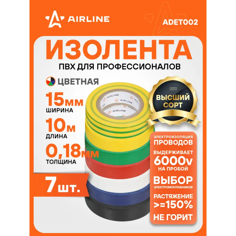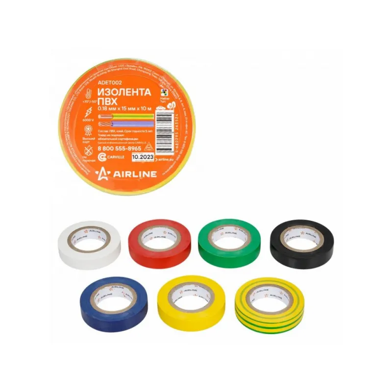 Изолента ПВХ, набор 7 шт.(син.,чёр.,кр.,зел., бел., желт., желто-зел.), 15 мм*10 м Описание: Изолента ПВХ, набор 7 шт, (синий, чёрный, красный, зеленый, белый, желтый, желто-зеленый) 10 мх19 мм AIRLINE ADET002 - универсальное решение для разных задач, преимущественно используется для обвязки и изоляции проводов. Изоляционная лента ПВХ, которая представлена в широком ассортименте, различается по цветам, ширине ленты и длине намотки. Изолента представляет собой расходный материал, предназначенный для обмотки проводов и кабелей с целью их электроизоляции. Изолента AIRLINE изготавливается из поливинилхлоридной пленки с нанесённым на неё клеевым слоем и полностью соответствует ГОСТу-16214-86. Использование: Для скрутки автопроводки: надежно изолирует соединения. Для компьютера и другого оборудования: защищает провода от повреждений и короткого замыкания. Для обмотки клюшки: улучшает сцепление и защищает клюшку от повреждений. Преимущества: - Высокая термостойкость: выдерживает высокие температуры. - Шумоизоляция и подавление вибрации: идеально подходит для установки автозвука. - Прочное сцепление: надежно крепится даже на рельефных поверхностях. - Эффективность: обеспечивает надежную защиту с минимальным количеством слоев. Инструкция по применению: 1. Очистите поверхность от грязи, пыли и влаги. 2. Плотно намотайте ленту на ремонтируемый участок. Особенности: - Горючесть - не горючая; - Температура использования - -50/+70 С; - Напряжение - 6000 В; - Температура монтажа - +5/+40 °С; - Толщина ленты - 0,18 мм; - Состав - пвх, клей; Товар официального производителя AIRLINE. Автотовар для внешнего тюнинга, который станет отличным подарком автомобилисту, мужчине и женщине, автолюбителю, папе, отцу, мужу, парню и другу. Характеристики: Артикул: ADET002 Ширина, мм: 19 Горючесть: не горючая Температура использования, С: -50/+70 Напряжение, В: 6000 Температура монтажа, °С: +5/+40 Толщина ленты, мм: 0,18 Длина, м: 10 Комплектация: Термоусадка с вкладышем - 1 шт Изолента - 7 шт Гарантия: от 1 года.