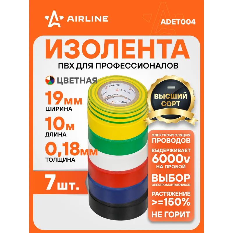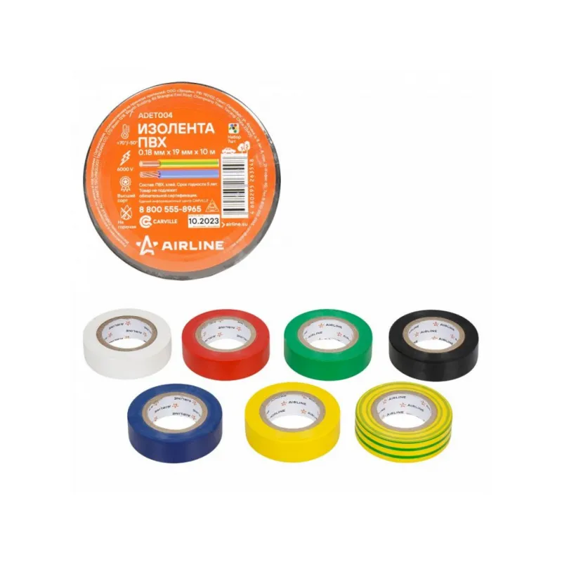 Изолента ПВХ, набор 7 шт.(син.,чёр.,кр.,зел., бел., желт., желто-зел.) 19 мм*10 м Описание: Изолента ПВХ, набор 7 шт, (синий, чёрный, красный, зеленый, белый, желтый, желто-зеленый) 10 мх19 мм AIRLINE ADET004 - универсальное решение для разных задач, преимущественно используется для обвязки и изоляции проводов. Изоляционная лента ПВХ, которая представлена в широком ассортименте, различается по цветам, ширине ленты и длине намотки. Изолента представляет собой расходный материал, предназначенный для обмотки проводов и кабелей с целью их электроизоляции. Изолента AIRLINE изготавливается из поливинилхлоридной пленки с нанесённым на неё клеевым слоем и полностью соответствует ГОСТу-16214-86. Использование: Для скрутки автопроводки: надежно изолирует соединения. Для компьютера и другого оборудования: защищает провода от повреждений и короткого замыкания. Для обмотки клюшки: улучшает сцепление и защищает клюшку от повреждений. Преимущества: - Высокая термостойкость: выдерживает высокие температуры. - Шумоизоляция и подавление вибрации: идеально подходит для установки автозвука. - Прочное сцепление: надежно крепится даже на рельефных поверхностях. - Эффективность: обеспечивает надежную защиту с минимальным количеством слоев. Инструкция по применению: 1. Очистите поверхность от грязи, пыли и влаги. 2. Плотно намотайте ленту на ремонтируемый участок. Особенности: - Горючесть - не горючая; - Температура использования - -50/+70 С; - Напряжение - 6000 В; - Температура монтажа - +5/+40 °С; - Толщина ленты - 0,18 мм; - Состав - пвх, клей; Товар официального производителя AIRLINE. Автотовар для внешнего тюнинга, который станет отличным подарком автомобилисту, мужчине и женщине, автолюбителю, папе, отцу, мужу, парню и другу. Характеристики: Артикул: ADET004 Ширина, мм: 19 Горючесть: нет Температура использования, С: -50/+70 Напряжение, В: 6000 Температура монтажа, °С: +5/+40 Толщина ленты, мм: 0,18 Длина, м: 10 Комплектация: Изолента - 7 шт Термоусадка с вкладышем - 1 шт Гарантия: от 1 года.