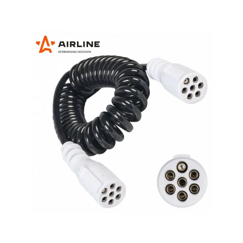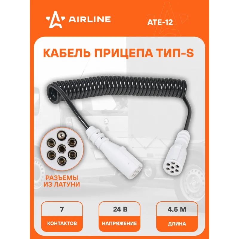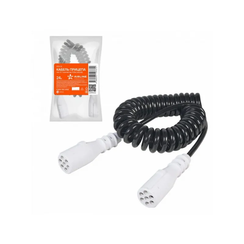 Кабель прицепа 24В тип-S 7 контактов 4,5м (литой) Описание: Кабель спиральный электрический для прицепа спиральный литой 24В тип-S 7 контактов 4.5 м AIRLINE ATE-12 Корпус вилки выполнен из прочного пластика. Электрические разъёмы спиралевидного кабеля выполнены из латуни и обеспечивают надёжный контакт. Прицепное устройство для прицепа предназначено для соединения автомобиля-тягача с прицепом. Благодаря тому, что кабель спирального типа, он очень компактный. Отлично подходит для тех случаев где соединение имеет очень высокую степень подвижности без больших механических нагрузок. Благодаря этому совместим практически со всеми прицепными устройствами. Особая форма и большая гибкость подобных изделий позволяет гарантировать их высокую надежность в условиях постоянных механических воздействий, трения и растяжений. Оригинальная спиралевидная конструкция значительно сокращает трение между токопроводящими жилами, значительно повышает электроизоляционные свойства всего кабеля. Характеристики: Артикул: ATE-12 OEM номера: 81.25411-6051 Количество контактов: 7 Материал корпуса: пластик Длина кабеля, м: 4.5 Комплектация: Кабель прицепа - 1 шт Гарантия: от 1 года.
