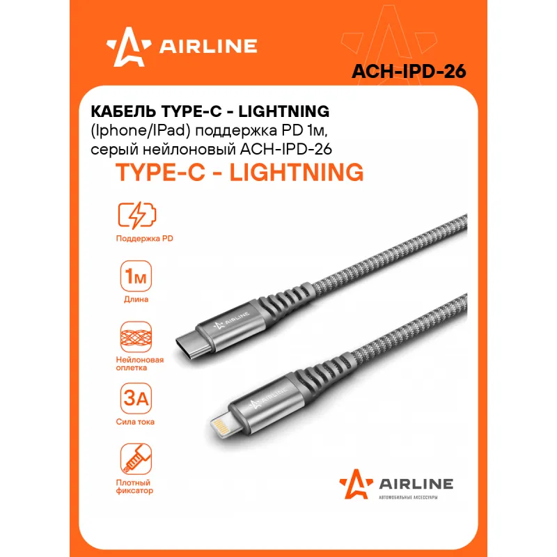 Кабель Type-C - Lightning (Iphone/IPad) поддержка PD 1м, серый нейлоновый Описание: Прочный и долговечный кабель для зарядки и синхронизации - надежный датакабель для вашего устройства. Оптимальный выбор для быстрой зарядки и эффективной передачи данных. Идеален для ежедневного использования благодаря своей устойчивости к износу и высокой функциональности. Отлично подходит для IPhone / IPad (Айфон / Айпад). Поддерживает cтандарт быстрой зарядки PD (Power Delivery). Характеристики: Артикул: ACH-IPD-26 Длина кабеля (включая штекер), см: 100 Напряжение питания, В: 5 Комплектация: Кабель - 1 шт Коробка с навершием - 1 шт Гарантия: от 1 года.