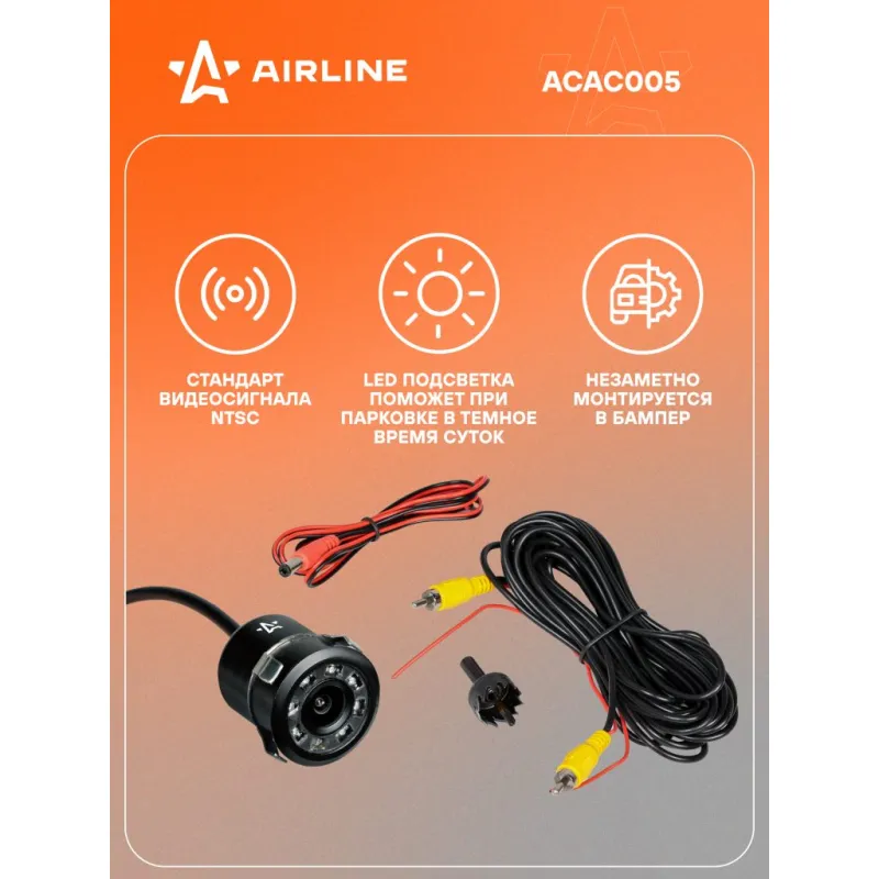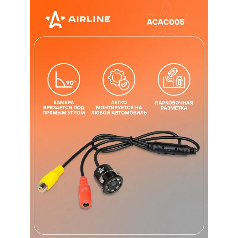 Камера заднего вида врезная прямая Описание: Камера заднего вида 12 В очень облегчает парковку задним ходом как новичков, так и опытных водителей. Камера незаметно устанавливается в / или под бампер вашего автомобиля, а провод, который идет в комплекте, протягивается через салон и подключается к вашему дополнительному или штатному дисплею. Ориентируясь по передаваемому видео, водитель безопасно совершает маневр. Подойдет для начинающих и неуверенных водителей совершать маневры на парковке и в узких проездах. Камера заднего подойдет к любому автомобилю и не будет заметна на корпусе. Аксессуар легко монтируется на любой автомобиль. Основные преимущества данной модели ACAC005: * Камера монтируется в заднюю часть автомобиля с помощью гайки, которую нужно закрутить в ответной части камеры; * Светодиоды, расположенные на камере помогут вам при парковке в темное время суток; * Камера монтируется (врезается) под прямым углом; * Угол обзора 170С; * LED подсветка, светодиоды, расположенных на камере помогут вам при парковке в темное время суток; * Парковочная разметка; * Стандарт защиты IP68; * Тип установки Врезное; * Стандарт видеосигнала - NTSC; * Минимальная освещенность - 0,2 люкс; Товар официального производителя AIRLINE. Инструкция по эксплуатации и установке в комплекте. Автотовар для внешнего тюнинга, который станет отличным подарком автомобилисту, мужчине и женщине, автолюбителю, папе, отцу, мужу, парню и другу. Характеристики: Артикул: ACAC005 Минимальная освещенность, люкс: 0,2 Угол обзора, °: 170 Стандарт видеосигнала: NTSC Напряжение питания, В: 12 Разрешение ТВЛ: 480 Разрешение: 640x480 Стандарт защиты: IP68 Тип установки: Врезное Комплектация: Камера заднего вида - 1 шт Провод удлинителя питания (12В +) - 1 шт Провод удлинителя видеосигнала - 1 шт Фреза 20мм - 1 шт Инструкция на русском языке - 1 шт Гарантийный талон - 1 шт Коробка - 1 шт Гарантия: от 1 года.