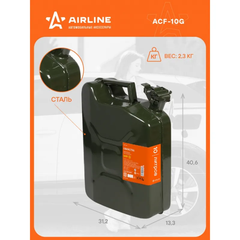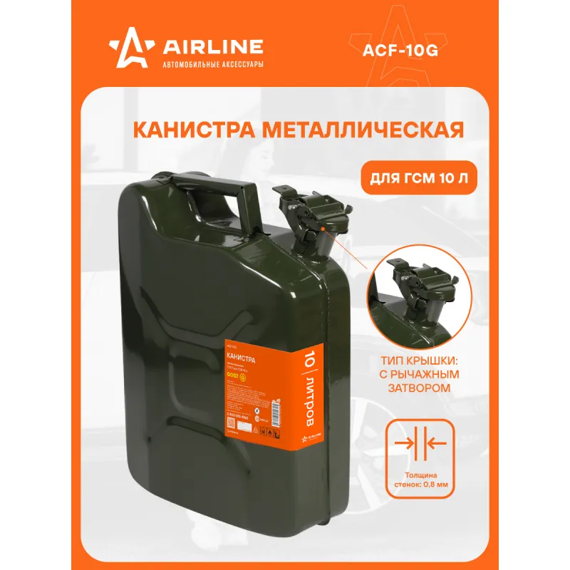 Канистра 10л ГОСТ металлическая Описание: Металлическая канистра ACF-10G ГОСТ бренда AIRLINE объемом 10 л - автомобильный аксессуар, который можно использовать для транспортировки и хранения бензина, дизеля или масла, в качестве основного или дополнительного топливного бака. Она оснащена крышкой с рычажным затвором, который удерживает крышку от самопроизвольного открытия. Горловина канистры оснащена воздушным каналом для быстрой и удобной заправки автомобиля. Удобный органайзер с ручкой подойдет для хранения любых горючесмазочных: бензинового или дизельного топлива. Также канистра подходит для разных жидкостей: тормозной, антифриз (тосол), простой и дистиллированной воды. Металлическая канистра будет удобна в качестве дорожной, домашней, экспедиционной, туристической водной тары для похода, поездки, дальней дороги. Займет немного места в багажнике или салоне вашей машинки, в хозяйственном помещении или на даче. Удобное хранение ГСМ и любых жидкостей, необходимых для эксплуатации не только машины любой марки, но и мотоцикла, квадроцикла, снегохода, снегоуборщика, мотоблока, газонокосилки, бензопилы, лодки или катера. Канистра - автомобильный аксессуар в авто будет отличным подарком для автомобилиста - мужа или папы, брата или любимого человека, парня или девушки, мужчины или женщины, вне зависимости от того, какую машину они водят - Volvo, Mercedes, BMW, Жигули, Ладу, Зил или Камаз. Автотовар поставляется в защитной упаковке для сохранности. Прямые поставки с завода - производителя. Сертифицировано в соответствии с законом о пожарной безопасности. Не накапливает статический заряд. Характеристики: Артикул: ACF-10G Материал: сталь Объем, л: 10 Тип крышки: с рычажным затвором Толщина стенок, мм: 0,8 Комплектация: Канистра с наклейкой - 1 шт Гарантия: от 1 года.