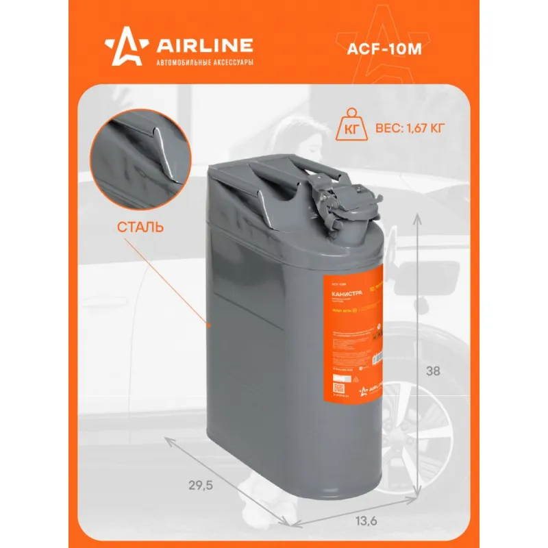 Канистра 10л металлическая Описание: Металлическая канистра ACF-10M бренда AIRLINE объемом 10 л - автомобильный аксессуар, который можно использовать для транспортировки и хранения бензина, дизеля или масла, в качестве основного или дополнительного топливного бака. Она оснащена крышкой с рычажным затвором, который удерживает крышку от самопроизвольного открытия. Горловина канистры оснащена воздушным каналом для быстрой и удобной заправки автомобиля. Удобный органайзер с ручкой подойдет для хранения любых горючесмазочных: бензинового или дизельного топлива. Также канистра подходит для разных жидкостей: тормозной, антифриз (тосол), простой и дистиллированной воды. Металлическая канистра будет удобна в качестве дорожной, домашней, экспедиционной, туристической водной тары для похода, поездки, дальней дороги. Займет немного места в багажнике или салоне вашей машинки, в хозяйственном помещении или на даче. Удобное хранение ГСМ и любых жидкостей, необходимых для эксплуатации не только машины любой марки, но и мотоцикла, квадроцикла, снегохода, снегоуборщика, мотоблока, газонокосилки, бензопилы, лодки или катера. Канистра - автомобильный аксессуар в авто будет отличным подарком для автомобилиста - мужа или папы, брата или любимого человека, парня или девушки, мужчины или женщины, вне зависимости от того, какую машину они водят - Volvo, Mercedes, BMW, Жигули, Ладу, Зил или Камаз. Автотовар поставляется в защитной упаковке для сохранности. Прямые поставки с завода - производителя. Сертифицировано в соответствии с законом о пожарной безопасности. Не накапливает статический заряд. Товар официального производителя AIRLINE. Характеристики: Артикул: ACF-10M Материал: сталь Объем, л: 10 Тип крышки: с рычажным затвором Толщина стенок, мм: 0,6 Комплектация: Канистра с наклейкой - 1 шт Гарантия: от 1 года.