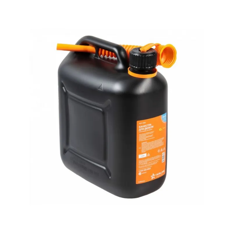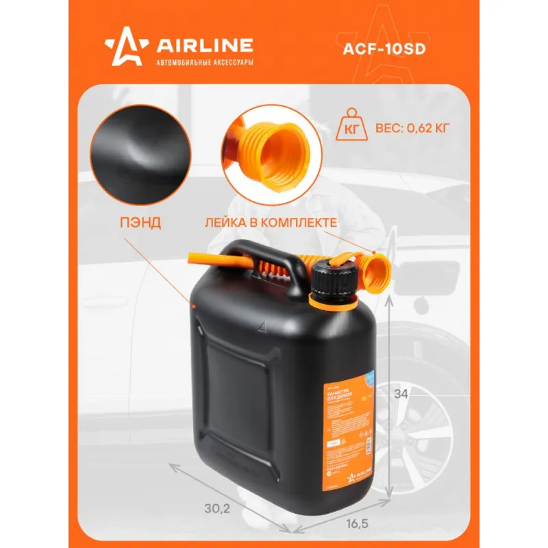 Канистра 10л пластиковая для дизеля, крышка с защитой от детей Описание: Пластиковая канистра ACF-10SD бренда AIRLINE объемом 10 л - автомобильный аксессуар, который можно использовать для транспортировки и хранения бензина, дизеля или масла, в качестве основного или дополнительного топливного бака. Она оснащена крышкой с клапаном - заглушкой (без прокладки) с защитой от открытия детьми, а также заливной лейкой с гибким гофрированным носиком. Гофрированный носик оснащен воздушным каналом для быстрой и удобной, совершенно чистой заправки бензобака автомобиля, замены и заливки масла без брызг в процессе заправочных работ. Универсальная модель изготовлена из первичного пластика (ПЭНД), плотного и легкого, с антистатическими свойствами, согласно обязательным требованиям пожарной безопасности при использовании канистр для ГСМ. Узкий носик глубоко входит внутрь горловины канистры для исключения потери и протекания жидкости, а также для минимизации запаха от испарения ГСМ. Канистра подходит для разных жидкостей: тормозной, антифриз (тосол), простой и дистиллированной воды. Пластиковая канистра станет альтернативой плоским металлическим емкостям или стеклянным бутылям. Займет немного места в багажнике или салоне вашей машины. Хранение ГСМ и любых жидкостей, необходимых для эксплуатации не только машины любой марки, но и мотоцикла, квадроцикла, снегохода, снегоуборщика, мотоблока, газонокосилки, бензопилы, лодки или катера. Пластиковая канистра - отличный подарок для автомобилиста - мужа или папы, брата или любимого человека, парня или девушки, мужчины или женщины, вне зависимости от того, какую машину они водят - Volvo, Mercedes, BMW, Жигули, Ладу, Зил или Камаз. Товар официального производителя AIRLINE. В нашем магазине, вы найдете широкий ассортимент высококачественных автотоваров, автозапчастей, аксессуары для мотоцикла, ремонтные комплекты, аксессуары для машины, электрооборудование, пластиковые, металлические, алюминиевые канистры и многое другое. Характеристики: Артикул: ACF-10SD Внутренний диаметр горловины, мм: 34 Объем, л: 10 Материал: ПЭНД Тип крышки: винтовая с защитой от детей Толщина стенок, мм: 1,3 Комплектация: Канистра с наклейкой, крышкой с защитой от детей и лейкой - 1 шт Гарантия: от 1 года.
