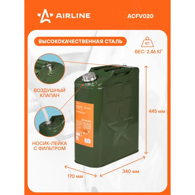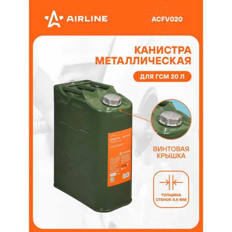 Канистра 20л металлическая, винтовая крышка Описание: Металлическая автомобильная канистра ACFV020 бренда AIRLINE объемом 20 л - автомобильный аксессуар и дополнительная емкость для транспортировки и хранения технических/горючих жидкостей, бензина, дизеля или масла, в качестве основного или дополнительного топливного бака. На корпусе канистры находится воздушных клапан. Внутри канистры расположен носик-лейка, благодаря которому можно удобно переливать жидкости в другие емкости или в горловину бензобака автомобиля. Носик-лейка оснащён фильтром резиновым уплотнением. Удобный органайзер с ручкой подойдет для хранения любых горючесмазочных: бензинового или дизельного топлива. Также канистра подходит для разных жидкостей: тормозной, антифриз (тосол), простой и дистиллированной воды. Металлическая канистра будет удобна в качестве дорожной, домашней, экспедиционной, туристической водной тары для похода, поездки, дальней дороги. Займет немного места в багажнике или салоне вашей машинки, в хозяйственном помещении или на даче. Удобное хранение ГСМ и любых жидкостей, необходимых для эксплуатации не только машины любой марки, но и мотоцикла, квадроцикла, снегохода, снегоуборщика, мотоблока, газонокосилки, бензопилы, лодки или катера. Канистра - автомобильный аксессуар в авто будет отличным подарком для автомобилиста - мужа или папы, брата или любимого человека, парня или девушки, мужчины или женщины, вне зависимости от того, какую машину они водят - Volvo, Mercedes, BMW, Жигули, Ладу, Зил или Камаз. Не накапливает статический заряд. Товар официального производителя AIRLINE. Характеристики: Артикул: ACFV020 Внутренний диаметр горловины, мм: 44 Объем, л: 20 Материал: сталь Тип крышки: винтовая Толщина стенок, мм: 0,5 Комплектация: Канистра 20 л с крышкой и стикером - 1 шт Гофрированный носик - 1 шт Гарантия: от 1 года.