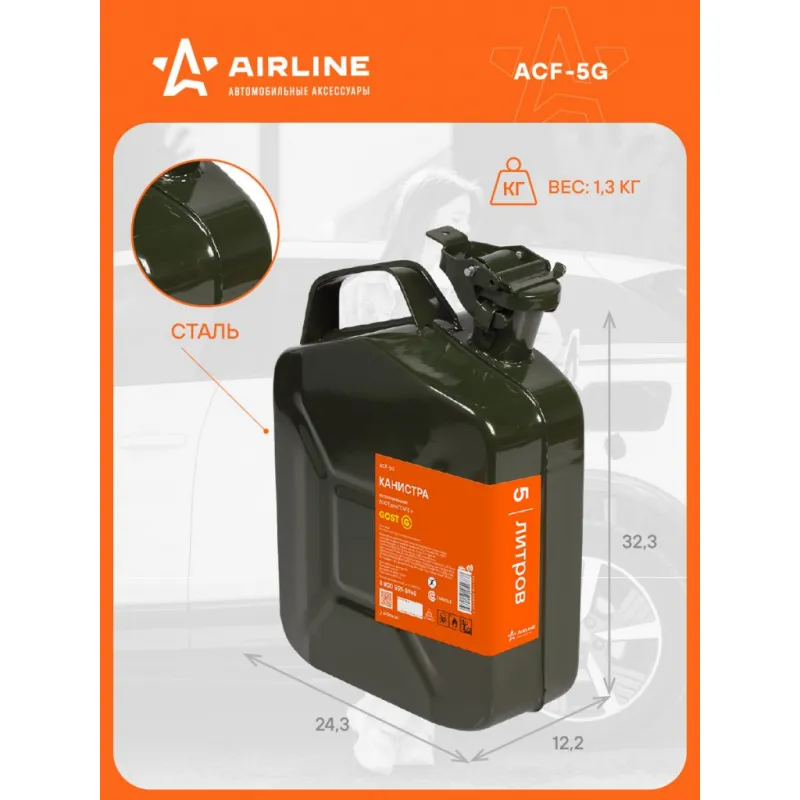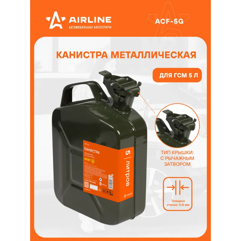 Канистра 5л ГОСТ металлическая Описание: Металлическая канистра ACF-5G ГОСТ бренда AIRLINE объемом 5 л - автомобильный аксессуар, который можно использовать для транспортировки и хранения бензина, дизеля или масла, в качестве основного или дополнительного топливного бака. Она оснащена крышкой с рычажным затвором, который удерживает крышку от самопроизвольного открытия. Горловина канистры оснащена воздушным каналом для быстрой и удобной заправки автомобиля. Удобный органайзер с ручкой подойдет для хранения любых горючесмазочных: бензинового или дизельного топлива. Также канистра подходит для разных жидкостей: тормозной, антифриз (тосол), простой и дистиллированной воды. Металлическая канистра будет удобна в качестве дорожной, домашней, экспедиционной, туристической водной тары для похода, поездки, дальней дороги. Займет немного места в багажнике или салоне вашей машинки, в хозяйственном помещении или на даче. Удобное хранение ГСМ и любых жидкостей, необходимых для эксплуатации не только машины любой марки, но и мотоцикла, квадроцикла, снегохода, снегоуборщика, мотоблока, газонокосилки, бензопилы, лодки или катера. Канистра - автомобильный аксессуар в авто будет отличным подарком для автомобилиста - мужа или папы, брата или любимого человека, парня или девушки, мужчины или женщины, вне зависимости от того, какую машину они водят - Volvo, Mercedes, BMW, Жигули, Ладу, Зил или Камаз. Автотовар поставляется в защитной упаковке для сохранности. Прямые поставки с завода - производителя. Сертифицировано в соответствии с законом о пожарной безопасности. Не накапливает статический заряд. Характеристики: Артикул: ACF-5G Материал: сталь Объем, л: 5 Тип крышки: с рычажным затвором Толщина стенок, мм: 0,8 Комплектация: Канистра с наклейкой - 1 шт Гарантия: от 1 года.