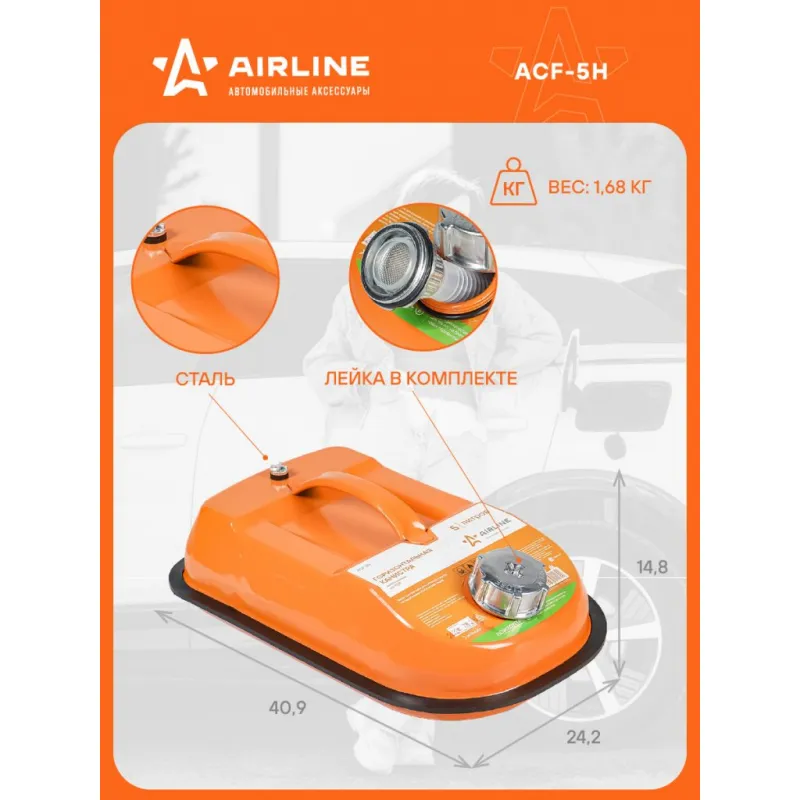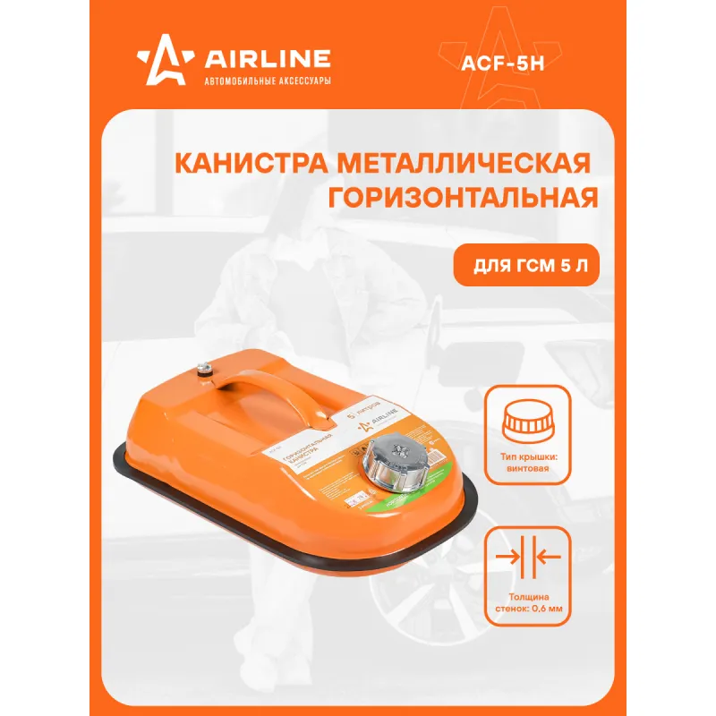 Канистра 5л металлическая горизонтальная Описание: Металлическая горизонтальная канистра ACF-5H бренда AIRLINE объемом 5 л - автомобильный аксессуар, который можно использовать для транспортировки и хранения бензина, дизеля или масла. Она оснащена крышкой с рычажным затвором, который удерживает крышку от самопроизвольного открытия. Горловина канистры оснащена воздушным каналом для быстрой и удобной заправки автомобиля. Горизонтальная канистра имеет самую устойчивую форму для транспортировки и хранения жидкостей, бензинового или дизельного топлива. Также канистра подходит для разных жидкостей: тормозной, антифриз (тосол), простой и дистиллированной воды. Внутренняя поверхность обработана специальным составом против коррозии. Металлическая канистра будет удобна в качестве дорожной, домашней, экспедиционной, туристической водной тары для похода, поездки, дальней дороги. Займет немного места в багажнике или салоне вашей машинки, в хозяйственном помещении или на даче. Удобное хранение ГСМ и любых жидкостей, необходимых для эксплуатации не только машины любой марки, но и мотоцикла, квадроцикла, снегохода, снегоуборщика, мотоблока, газонокосилки, бензопилы, лодки или катера. Канистра - автомобильный аксессуар в авто будет отличным подарком для автомобилиста - мужа или папы, брата или любимого человека, парня или девушки, мужчины или женщины, вне зависимости от того, какую машину они водят - Volvo, Mercedes, BMW, Жигули, Ладу, Зил или Камаз. Автотовар поставляется в защитной упаковке для сохранности. Сертифицировано в соответствии с законом о пожарной безопасности. Не накапливает статический заряд. Товар официального производителя AIRLINE. Характеристики: Артикул: ACF-5H Внутренний диаметр горловины, мм: 44 Объем, л: 5 Материал: сталь Тип крышки: винтовая Толщина стенок, мм: 0,6 Комплектация: Канистра металлическая горизонтальная с лейкой и наклейкой - 1 шт Гарантия: от 1 года.