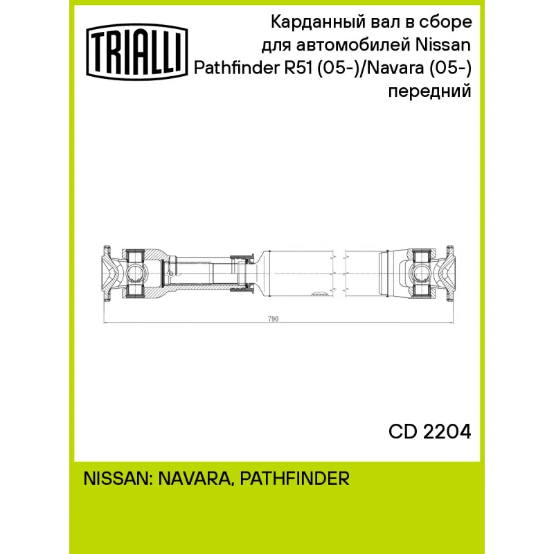 Карданный вал в сборе для автомобилей Nissan Pathfinder R51 (05-)/Navara (05-) (4WD) передний Характеристики: Артикул: CD 2204 OEM номера: 37200-5X30A, 37200EB300 Материал: Сталь, резина Особенности конструкции:: Крестовина Длина (мин.): 790 Диаметр вала: 63,5 Гарантийный срок: 2 год/60 000 км Товарная линейка: BLACK Количество на автомобиль: 1 Комплектация: Карданный вал - 1 шт Гарантия: от 1 года.