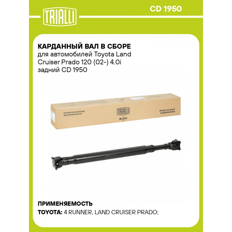 Карданный вал в сборе для автомобилей Toyota Land Cruiser Prado 120 (02-) 4.0i задний Характеристики: Артикул: CD 1950 OEM номера: 37110-6A440 Материал: Комбинированный Особенности конструкции:: Крестовина Длина (мин.): 1184 Диаметр вала: 76 Гарантийный срок: 2 год/60 000 км Товарная линейка: BLACK Количество на автомобиль: 1 Комплектация: Карданный вал - 1 шт Гарантия: от 1 года.