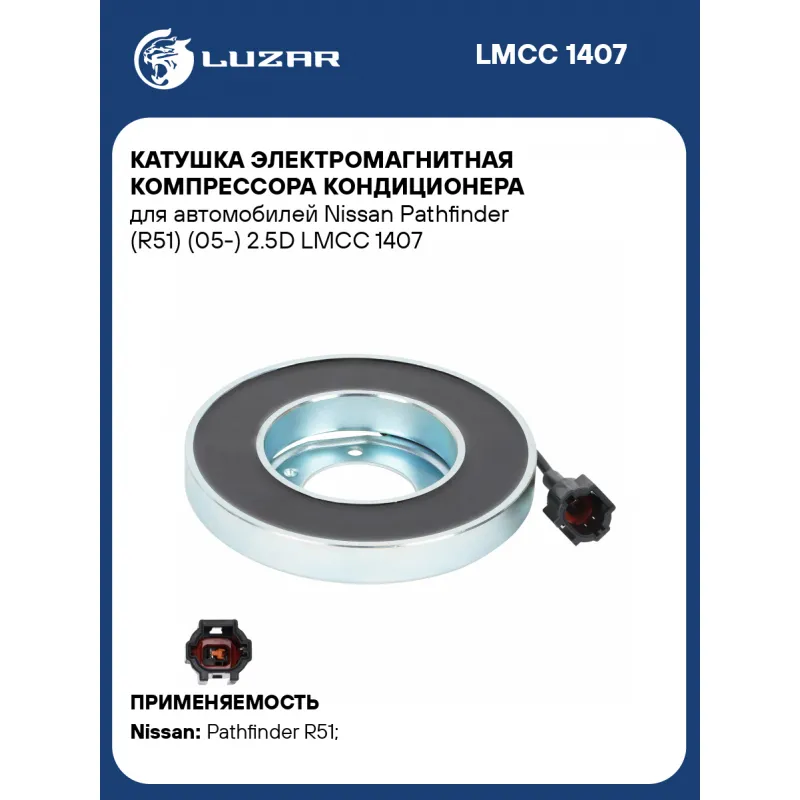 Катушка электромагнитная компрессора кондиционера для автомобилей Nissan Pathfinder (R51) (05-) 2.5D Характеристики: Артикул: LMCC 1407 OEM номера: 92660-EB300 Сопутствующий товар:: LMAC 1407 Количество на автомобиль: 1 Напряжение, В: 12 Ограничение производителя: Valeo/Zexel Ид.№ компрессора: DKS17D Совместимость с компрессорами LUZAR: Несовместим Совместим с компрессорами кондиционера: 92600-EB01A, 92660-EB01B, 92660-EB300 Подходит для авто: Nissan Pathfinder R51 (05-) Для проверки применяемости отправьте VIN автомобиля через вкладку "Есть вопросы о товаре?" Комплектация: Катушка электромагнитная - 1 шт Паспорт изделия - 1 шт Гарантия: от 1 года.