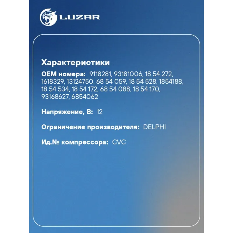 | Совместимость с компрессорами LUZAR | Совместим c LCAC 2129 |