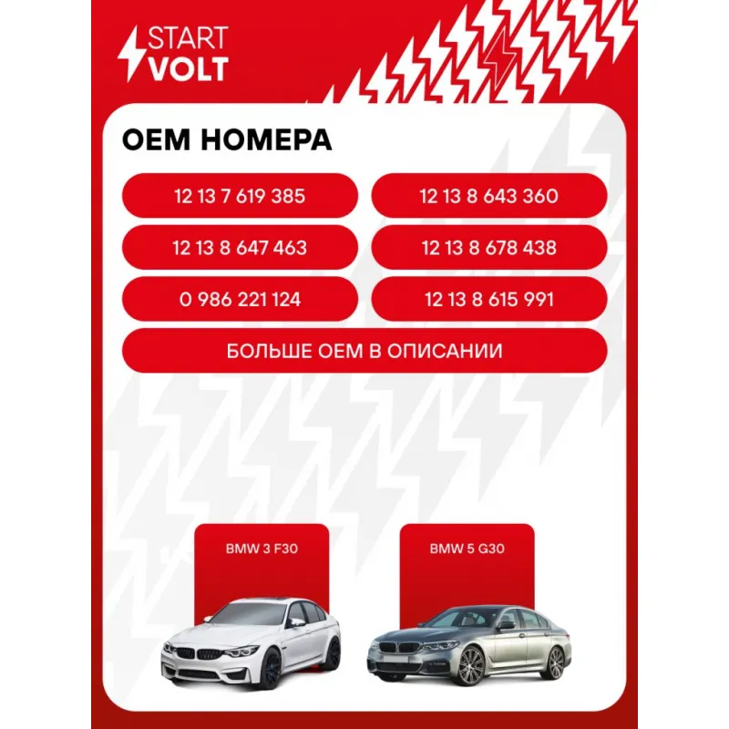 Катушка зажигания для автомобилей BMW 3 F30 (15-)/5 G30 (16-) 1.5T/2.0T/3.0T Характеристики: Артикул: SC 2621 OEM номера: 12 13 7 619 385, 12 13 8 643 360, 12 13 8 647 463, 12 13 8 678 438, 0 986 221 124, 134090, 12 13 8 615 991, 7 619 385, 8 615 991, 8 643 360, 8 647 463, 8 678 438, 90118-WA474 Количество контактов: 3 Выходное напряжение, кВ: 24 Номинальное напряжение, В: 12 Наличие коммутатора: нет Первичное сопротивление, Ом: 0,42 Первичная индуктивность, мН: 1,9 Энергия искры, мДж: 72 Подходит для авто: BMW 1 F20/F21 (11-), 1 F20/F21 (11-), 3 F3x (11-), 4 F3x (13-), 5 G30 (16-) Для проверки применяемости отправьте VIN автомобиля через вкладку "Есть вопросы о товаре?" Комплектация: Паспорт изделия/гарантийный талон - 1 шт Катушка зажигания - 1 шт Гарантия: от 1 года.
