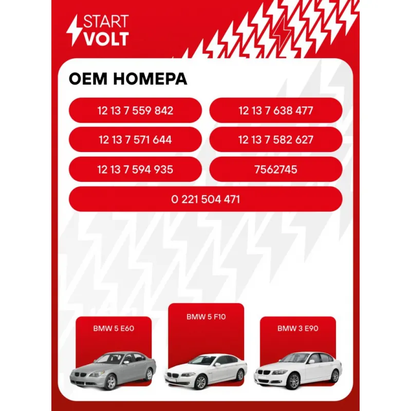 Катушка зажигания для автомобилей BMW 5 E60 (07-)/5 F10 (09-)/3 E90 (07-) 2.0i/3.0i Характеристики: Артикул: SC 2620 OEM номера: 12 13 7 559 842, 12 13 7 638 477, 12 13 7 571 644, 12 13 7 582 627, 12 13 7 594 935, 7 562 745, 0 221 504 471 Количество контактов: 3 Выходное напряжение, кВ: 26 Номинальное напряжение, В: 12 Наличие коммутатора: Отсутствует Первичное сопротивление, Ом: 0,64 Первичная индуктивность, мН: 2,5 Энергия искры, мДж: 45,6 Подходит для авто: BMW 1 E81/E87 (04-), 3 E90 (05-), 5 E60 (03-), 6 E63/E64 (03-) Для проверки применяемости отправьте VIN автомобиля через вкладку "Есть вопросы о товаре?" Комплектация: Паспорт изделия/гарантийный талон - 1 шт Катушка зажигания - 1 шт Гарантия: от 1 года.